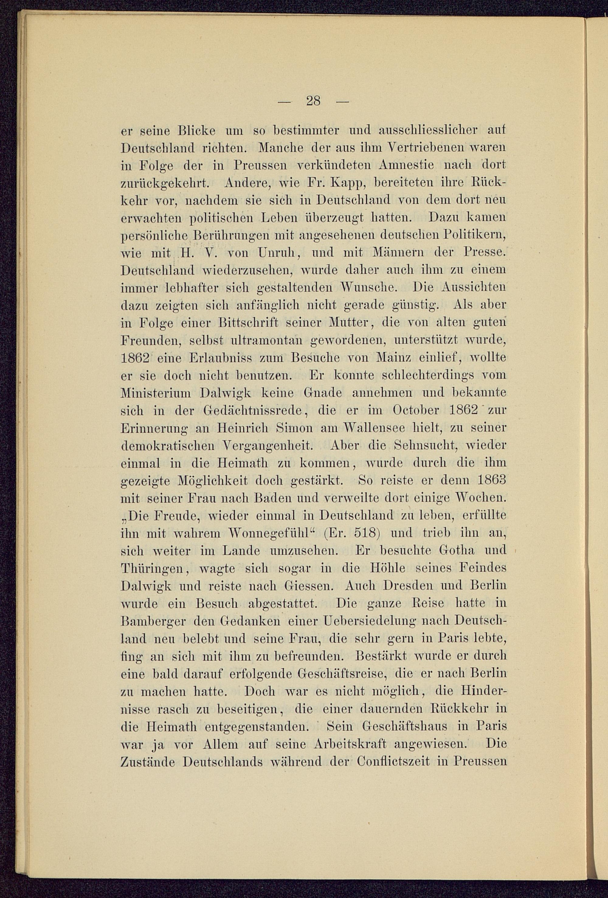 er seine Blicke um so bestimmter und ausschliesslicher aufDeutschland richten. Manche der aus ihm Vertriebenen warenin Folge der in Preussen verkündeten Amnestie nach dortzurückgekehrt. Andere, wie Fr. Kapp, bereiteten ihre Rück-kehr vor, nachdem sie sich in Deutschland von dem dort neuerwachten politischen Lehen überzeugt batten. Dazu kamenpersönliche Berührungen mit angesehenen deutschen Politikern,wie mit II. V. von Unruh , und mit Männern der Presse.Deutschland wiederzusehen, wurde daher auch ihm zu einemimmer lebhafter sich gestaltenden Wunsche. Die Aussichtendazu zeigten sich anfänglich nicht gerade günstig. Als aberin Folge einer Bittschrift seiner Mutter, die von alten gutenFreunden, selbst ultramontan gewordenen, unterstützt wurde,1862 eine Erlaubniss zum Besuche von Mainz einlief, wollteer sie doch nicht benutzen. Er konnte schlechterdings vomMinisterium Dalwigk keine Gnade annehmen und bekanntesich in der Gedächtnissrede, die er im October 1862 zurErinnerung an Heinrich Simon am Wallensee hielt, zu seinerdemokratischen Vergangenheit. Aber die Sehnsucht, wiedereinmal in die Heimath zu kommen, wurde durch die ihmgezeigte Möglichkeit doch gestärkt. So reiste er denn 1863mit seiner Frau nach Baden und verweilte dort einige Wochen.„Die Freude, wieder einmal in Deutschland zu leben, erfüllteihn mit wahrem Wonnegefühl“ (Er. 518) und trieb ihn an,sich weiter im Lande umzusehen. Er besuchte Gotha undThüringen , wagte sich sogar in die Höhle seines FeindesDalwigk und reiste nach Giessen. Auch Dresden und Berlin wurde ein Besuch abgestattet. Die ganze Reise hatte inBamberger den Gedanken einer Uebersiedelung nach Deutsch-land neu belebt und seine Frau, die sehr gern in Paris lebte,ting an sich mit ihm zu befreunden. Bestärkt wurde er durcheine bald darauf erfolgende Geschäftsreise, die er nach Berlin zu machen hatte. Doch war es nicht möglich, die Hinder-nisse rasch zu beseitigen, die einer dauernden Rückkehr indie Heimath entgegenstanden. Sein Geschäftshaus in Paris war ja vor Allem auf seine Arbeitskraft angewiesen. DieZustände Deutschlands während der Conflictszeit in Preussen