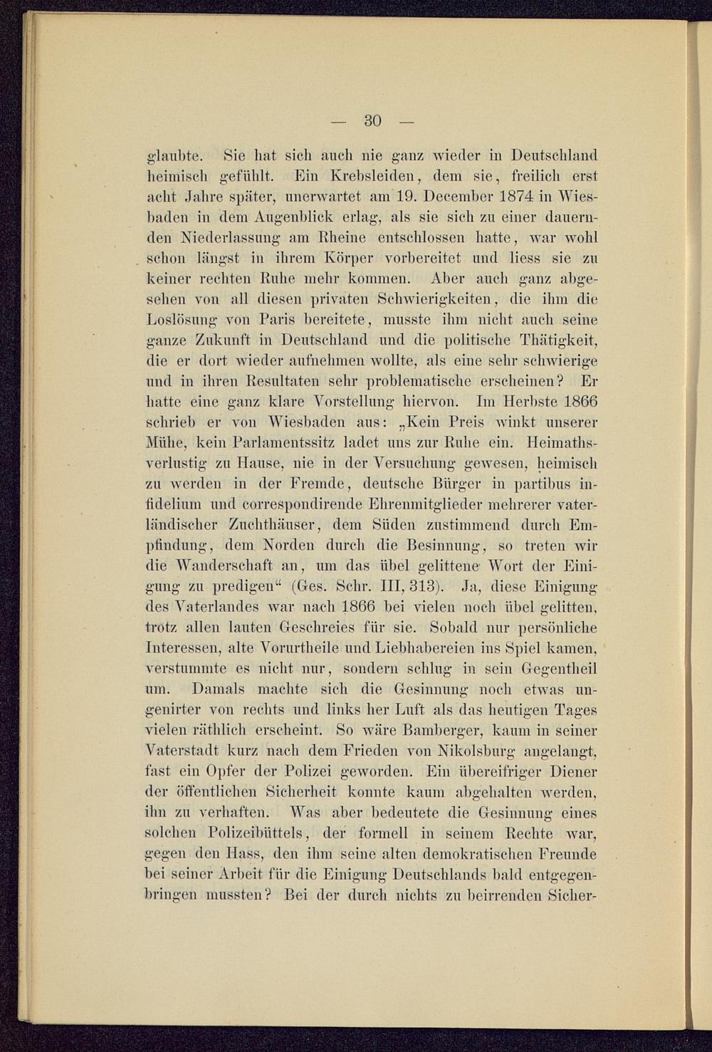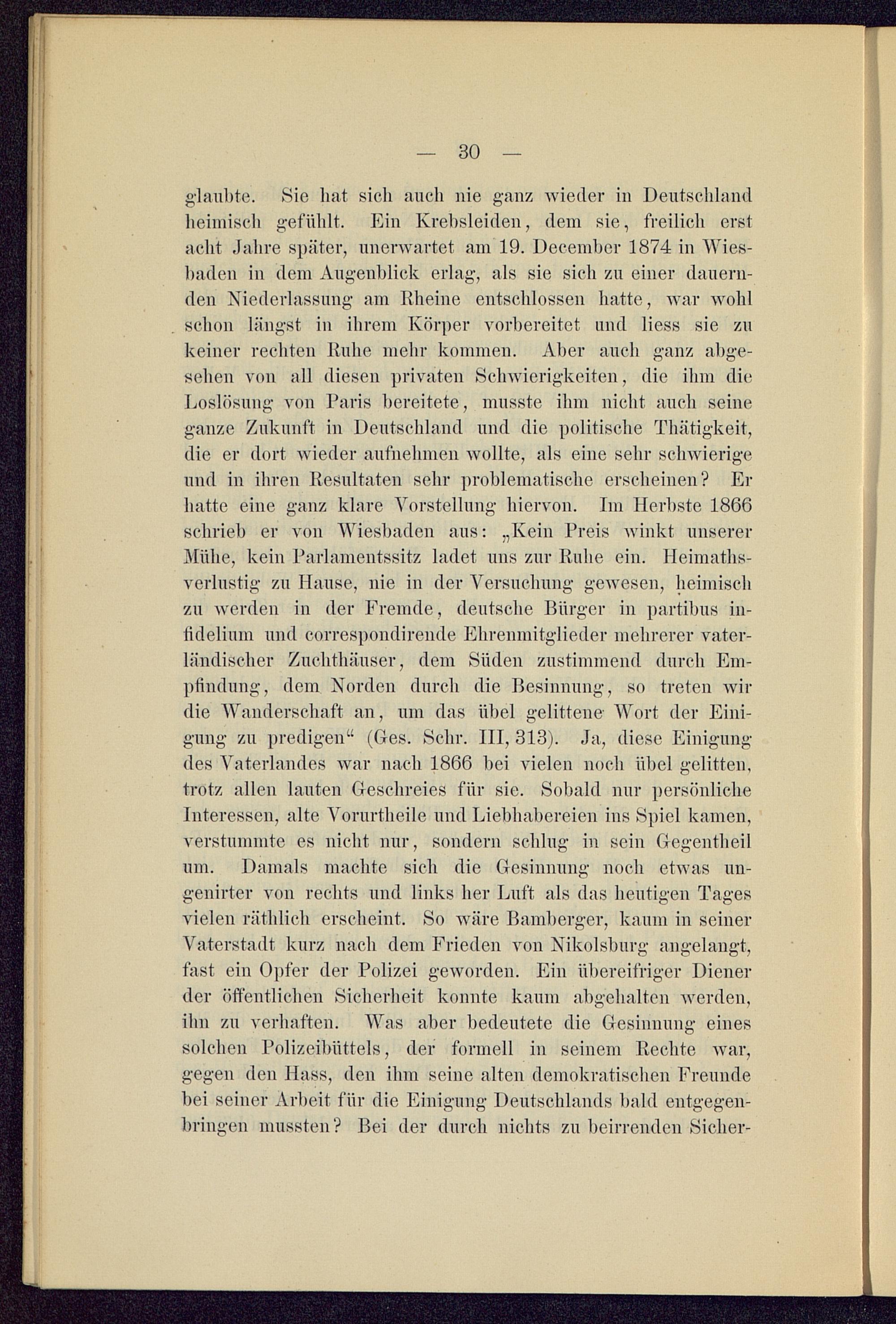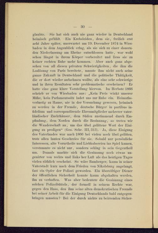 glaubte. Sie hat sich auch nie ganz nieder in Deutschland heimisch gefühlt. Ein Krebsleiden, dem sie, freilich erstacht Jahre später, unerwartet am 19. Decembcr 1874 in Wies-baden in dem Augenblick erlag, als sie sich zu einer dauern-den Niederlassung am Rheine entschlossen hatte, war wohlschon längst in ihrem Körper vorbereitet und Hess sie zukeiner rechten Hube mehr kommen. Aber auch ganz abge-sehen von all diesen privaten Schwierigkeiten, die ihm dieLoslösung von Paris bereitete, musste ihm nicht auch seineganze Zukunft in Deutschland und die politische Thiitigkeit,die er dort wieder aufnehmen wollte, als eine sehr schwierigeund in ihren Resultaten sehr problematische erscheinen? Erhatte eine ganz klare Vorstellung hiervon. Im Herbste 1866schrieb er von Wiesbaden aus: „Kein Preis winkt unsererMühe, kein Parlamentssitz ladet uns zur Ruhe ein. Heimaths-verlustig zu Hause, nie in der Versuchung gewesen, heimischzu werden in der Fremde , deutsche Bürger in partibus in-tidelium und correspomlirende Ehrenmitglieder mehrerer vater-ländischer Zuchthäuser, dem Süden zustimmend durch Em-pfindung, dem Norden durch die Besinnung, so treten wirdie Wanderschaft an, um das übel gelittene Wort der Eini-gung zu predigen“ (Ges. Sehr. III, 313). Ja, diese Einigungdes Vaterlandes war nach 1866 bei vielen noch übel gelitten,trotz allen lauten Geschreies für sie. Sobald nur persönlicheInteressen, alte Vorurtheile und Liebhabereien ins Spiel kamen,verstummte es nicht nur, sondern schlug in sein Gegentheilum. Damals machte sich die Gesinnung noch etwas un-genirter von rechts und links her Luft als das heutigen Tagesvielen räthlich erscheint. So wäre Bamberger, kaum in seinerVaterstadt kurz nach dem Frieden von Nikolsburg angelangt,fast ein Opfer der Polizei geworden. Ein übereifriger Dienerder öffentlichen Sicherheit konnte kaum abgehalten werden,ihn zu verhaften. Was aber bedeutete die Gesinnung einessolchen Polizeibüttels, der formell in seinem Rechte war,gegen den Hass, den ihm seine alten demokratischen Freundebei seiner Arbeit für die Einigung Deutschlands bald entgegen-bringen mussten? Bei der durch nichts zu beirrenden Sicher-