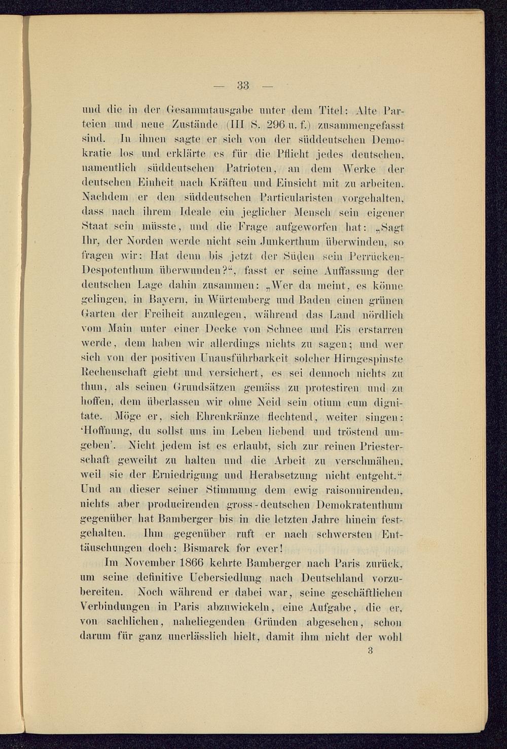und diu in der Gesammtausgabe unter dem Titel: Alte Par-teien und neue Zustände (III S. 296 u. f.) zusammengefasstsind. In ihnen sagte er sieh von der süddeutsehen Demo-kratie los und erklärte es für die Ptlielit jedes deutsehen,namentlieh süddeutsehen Patrioten, an dem Werke derdeutschen Einheit nach Kräften und Einsicht mit zu arbeiten.Nachdem er den süddeutsehen Partieularisten Vorbehalten,dass nach ihrem Ideale ein jeglicher Mensch sein eigenerStaat sein müsste, und die Frage aufgeworfen hat: -SagtIhr, der Norden werde nicht sein .lunkerthnm überwinden, sofragen wir: Hat denn bis jetzt der Süden sein Pemieken-Dcspotenthum überwunden?“, fasst er seine Auffassung derdeutsehen Lage dahin zusammen: „Wer da meint, es könnegelingen, in Payern, in Würtemberg und Baden einen grünenHarten der Freiheit anzulegen, während das Land nördlichvom Main unter einer Decke von Schnee und Eis erstarrenwerde, dem haben wir allerdings nichts zu sagen; und wersieh von der positiven Unausführbarkeit solcher HirngespinsteRechenschaft giebt und versichert, es sei dennoch nichts zutliun, als seinen (1 rundsätzen gemäss zu protestiren und zuhoffen, dem überlassen wir ohne Neid sein otium cum digni-tate. Möge er, sieh Ehrenkränze flechtend, weiter singen:•Hoffnung, du sollst uns im Leben liebend und tröstend um-geben’. Nicht, jedem ist es erlaubt, sieh zur reinen Priester-schaft geweiht zu halten und die Arbeit zu verschmähen,weil sie der Erniedrigung und Herabsetzung nicht entgeht.“Und an dieser seiner Stimmung dem ewig raisonnirenden.nichts aber produrirenden gross - deutschen Demokratenthumgegenüber hat Bamberger bis in die letzten Jahre hinein fest-gehalten. Ihm gegenüber ruft er nach schwersten Ent-täuschungen docb: Bismarck tbr ever!