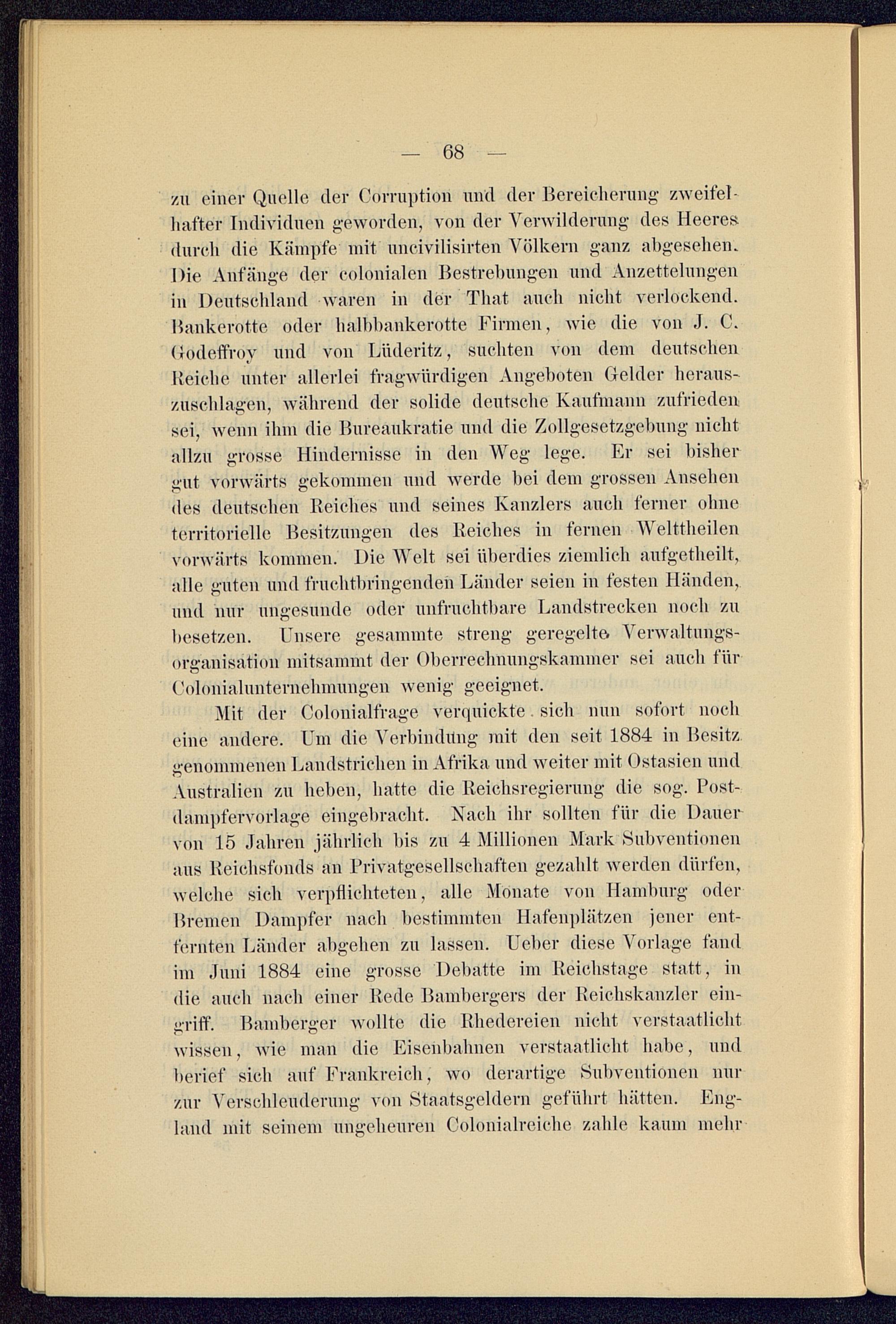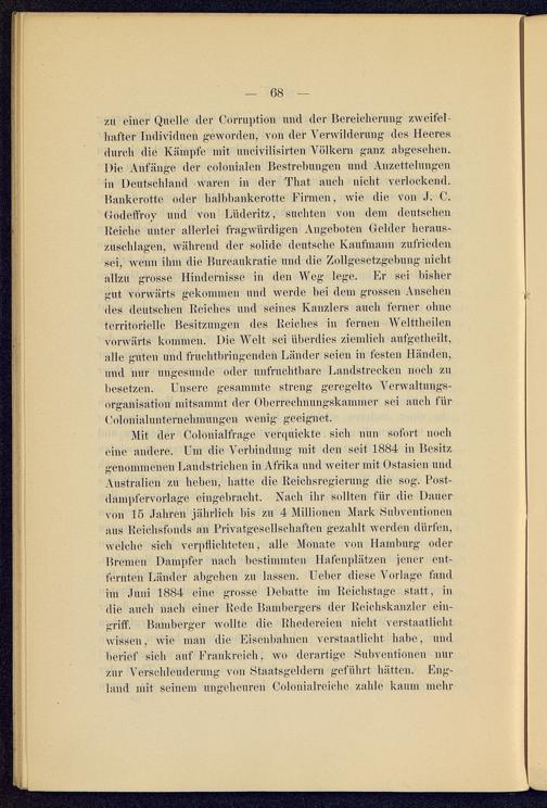 zu einer Quelle der Corruption und der Bereicherung zweifeihafter Individuen geworden, von der Verwilderung des Heeresdurch die Kämpfe mit uncivilisirten Völkern ganz abgesehen.Die Anfänge der colonialen Bestrebungen und Anzettelungenin Deutschland waren in der Tliat auch nicht verlockend.Bankerotte oder halbbankerotte Firmen, wie die von J. C.Codeffroy und von Liideritz, suchten von dem deutschenReiche unter allerlei fragwürdigen Angeboten Helder heraus-zuschlagen, während der solide deutsche Kaufmann zufriedensei, wenn ihm die Bureaukratie und die Zollgesetzgebung nichtallzu grosse Hindernisse in den Weg lege. Er sei bishergut vorwärts gekommen und werde bei dem grossen Ansehen<les deutschen Keiehes und seines Kanzlers auch ferner ohneterritorielle Besitzungen des Reiches in fernen Welttheilenvorwärts kommen. Die Welt sei überdies ziemlich aufgetheilt,alle guten und fruchtbringenden Länder seien in festen Händen,und nur ungesunde oder unfruchtbare Landstrecken noch zubesetzen. Unsere gesummte streng geregelte. Verwaltungs-organisation mitsammt der Oberrechnungskammer sei auch für(’olonialunternehmungen wenig geeignet.