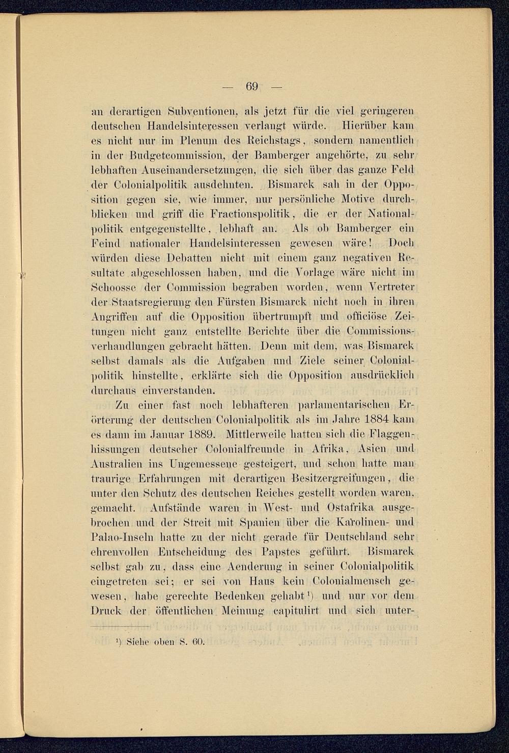 Zu einer fast noch lebhafteren parlamentarischen Er-örterung der deutschen Colonialpolitik als im Jahre 1884 kames dann im Januar 1889. Mittlerweile hatten sich die Flaggen-hissungen deutscher Colonialfreunde in Afrika, Asien undAustralien ins Ungemessene gesteigert, und schon hatte mantraurige Erfahrungen mit derartigen Besitzergreifungen, dieunter den Schlitz des deutschen Reiches gestellt worden waren,gemacht. Aufstände waren in West- und Ostafrika ausge-brochen und der Streit mit Spanien über die KaVolinen- undPalao-Inseln lmttc zu der nicht gerade für Deutschland sehrehrenvollen Entscheidung des Papstes geführt. Bismarck selbst gab zu, dass eine Aemlerung in seiner Colonialpolitikeingetreten sei; er sei von Haus kein Colonialmensch ge-wesen, habe gerechte Bedenken gehabt’) und nur vor demDruck der öffentlichen Meinung capitulirt und sich unter-