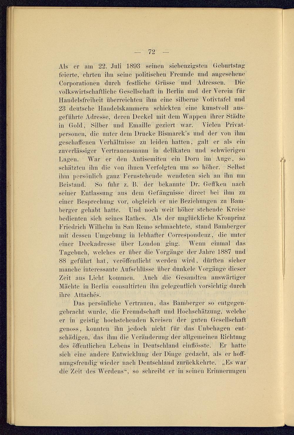 Als er am 22. Juli 1893 seinen siebenzigsten Geburtstagfeierte, ehrten ihn seine politischen Freunde und angesehene(Jorporationen durch festliche Griisse und Adressen. Dievolkswirtschaftliche Gesellschaft in Berlin und der Verein fürHandelsfreiheit überreichten ihm eine silberne Votivtafel und23 deutsche Handelskammern schickten eine kunstvoll aus-geführte Adresse, deren Deckel mit dem Wappen ihrer Städtein Gold, Silber und Emaille geziert war. Vielen Privat-personen, die unter dem Drucke Bismarck’s und der von ihmgeschaffenen Verhältnisse zu leiden hatten, galt er als einzuverlässiger Vertrauensmann in delikaten und schwierigenLagen. War er den Antisemiten ein Dorn im Auge, soschätzten ihn die von ihnen Verfolgten um so höher. Selbstihm persönlich ganz Fernstehende wendeten sich an ihn umBeistand. So fuhr z. B. der bekannte Dr. Geffken nachseiner Entlassung aus dem Gefängnisse direct bei ihm zueiner Besprechung vor, obgleich er nie Beziehungen zu Bam-berger gehabt hatte. Und noch weit höher stehende Kreisebedienten sich seines Käthes. Als der unglückliche KronprinzFriedrich AVilhelm in San Kennt schmachtete, stand Bambergermit dessen Umgebung in lebhafter Oorrespondenz, die untereiner Deckadresse über London ging. Wenn einmal dasTagebuch, welches er über die Vorgänge der Jahre 1887 und88 geführt hat, veröffentlicht werden wird, dürften sichermanche interessante Aufschlüsse über dunkele Vorgänge dieserZeit ans Licht kommen. Auch die Gesandten auswärtigerMächte in Berlin consultirtcn ihn gelegentlich vorsichtig durchihre Attaches.