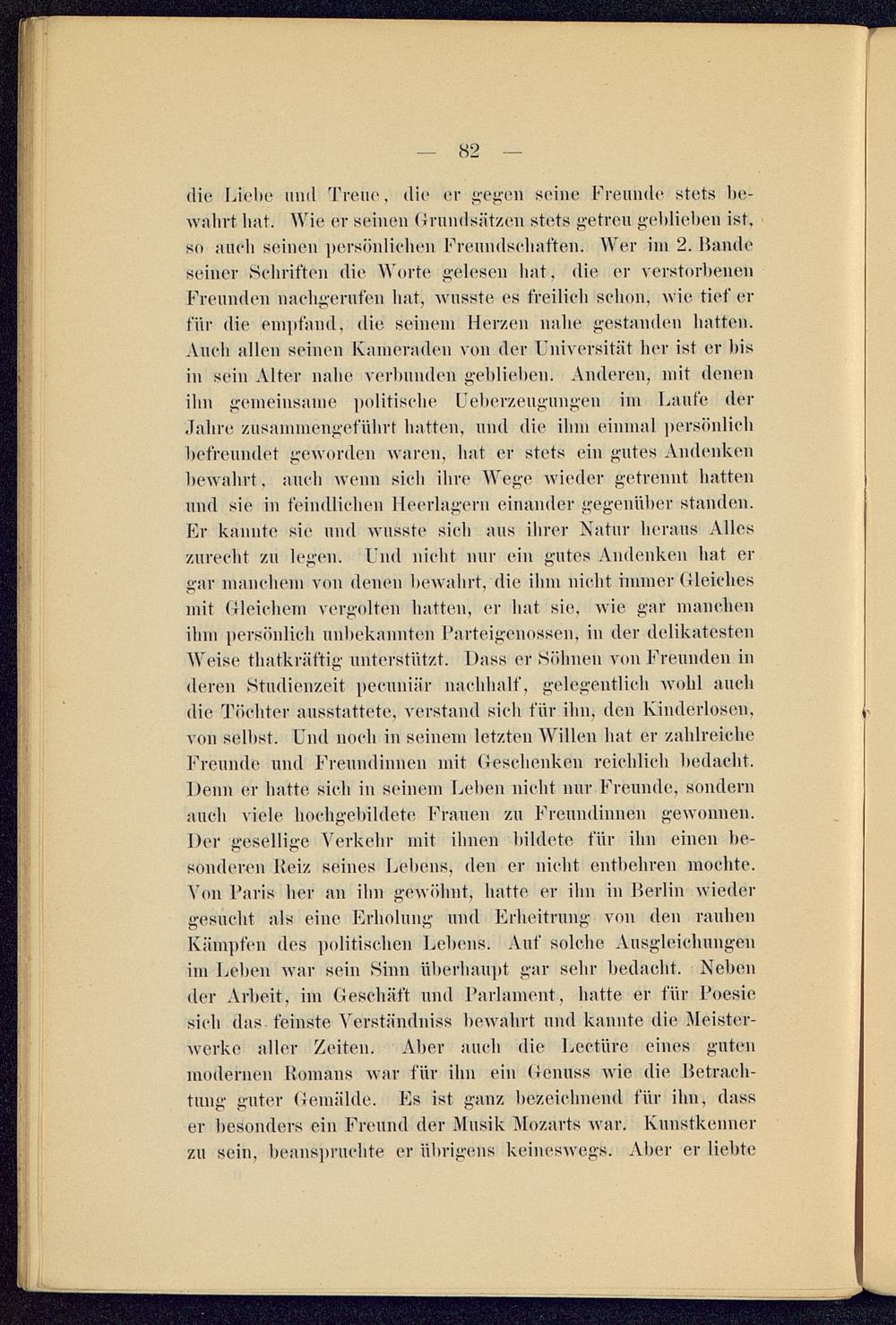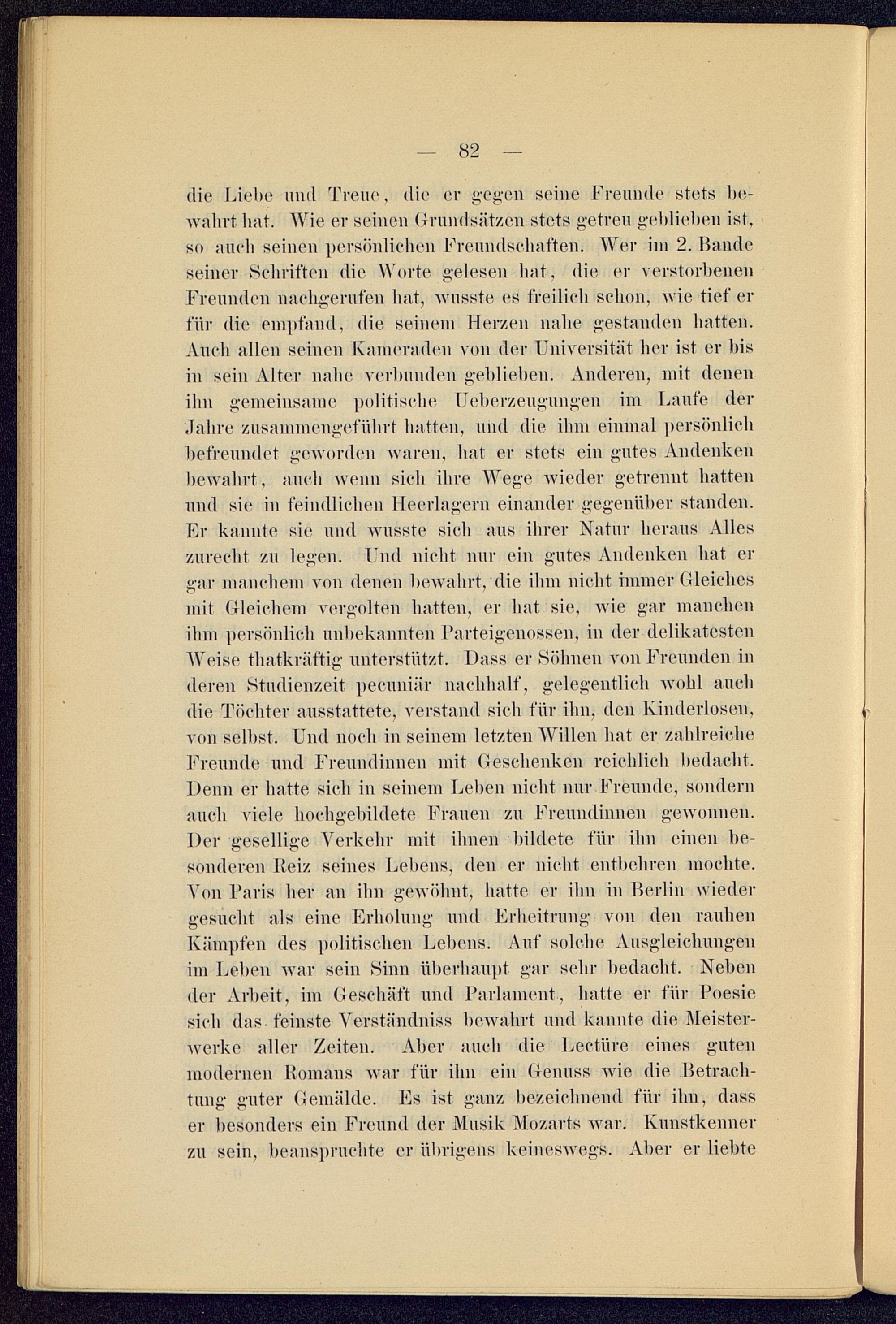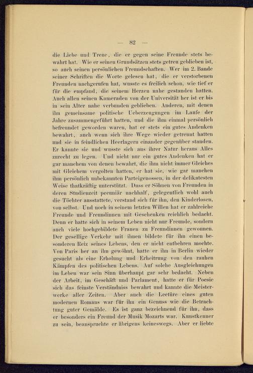 die Liebe und Treue, die er gegen seine Freunde stets be-wahrt hat. Wie er seinen Grundsätzen stets getreu geblieben ist,so auch seinen persönlichen Freundschaften. Wer im 2. Bandeseiner Schriften die Worte gelesen hat. die er verstorbenenFreunden nachgerufen hat, wusste es freilich schon, wie tief erfür die empfand, die seinem Herzen nahe gestanden hatten.Auch allen seinen Kameraden von der Universität her ist ev bisin sein Alter nahe verbunden geblieben. Anderen, not denenihn gemeinsame politische Ueberzeugungen im Laufe derJahre zusammengeführt hatten, und die ihm einmal persönlichbefreundet geworden waren, hat er stets ein gutes Andenkenbewahrt, auch wenn sich ihre Wege wieder getrennt hattenund sie in feindlichen Heerlagern einander gegenüber standen.Er kannte sie und wusste sieh aus ihrer Natur heraus Alleszurecht zu legen. Und nicht nur ein gutes Andenken hat ergar manchem von denen bewahrt, die ihm nicht immer Gleichesmit Gleichem vergolten hatten, er hat sie, wie gar manchenihm persönlich unbekannten Parteigenossen, in der delikatestenWeise thatkriiftig unterstützt. Dass er Söhnen von Freunden inderen Studienzeit peeunilir nachhalf, gelegentlich wohl auchdie Töchter ausstattete, verstand sich für ihn, den Kinderlosen,von selbst. Und noch in seinem letzten Willen hat er zahlreicheFreunde und Freundinnen mit Geschenken reichlich bedacht.Denn er hatte sich in seinem Leben nicht nur Freunde, sondernauch viele hochgebildete Frauen zu Freundinnen gewonnen.Der gesellige Verkehr mit ihnen bildete für ihn einen be-sonderen Reiz seines Lebens, den er nicht entbehren mochte.Von Paris her an ihn gewöhnt, hatte er ihn in Berlin wiedergesucht als eine Erholung und Erheitrung von den rauhenKii u des politischen Lehens. Auf solche Ausgleichungenim Leben war sein Sinn überhaupt, gar sehr bedacht. Nebender Arbeit, im Geschäft und Parlament, hatte er für Poesiesich das feinste Verständnis» bewahrt und kannte die Meister-werke aller Zeiten. Aber auch die Lectürc eines gutenmodernen Romans war für ihn ein Genuss wie die Betrach-tung guter Gemälde. Es ist ganz bezeichnend für ihn, dasser besonders ein Freund der Musik Mozarts war. Kunstkennerzu sein, beanspruchte er übrigens keineswegs. Aber er liebte