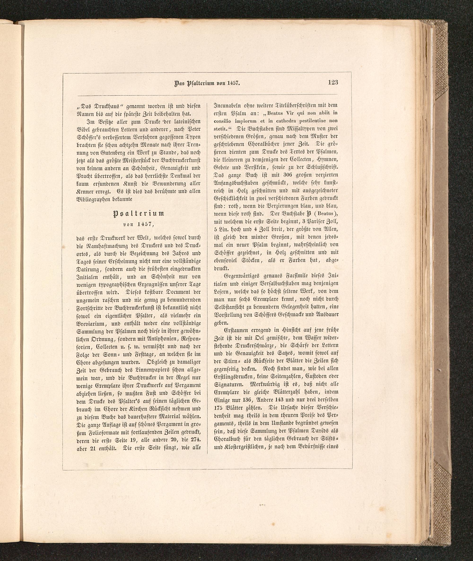 Erstaunen erregend in Hinsicht ans jene früheZeit ist die mit Ocl gemischte, dem Wasser wider-stehende Druckerschwärze, die Scharfe der Letternund die Genauigkeit des Satzes, womit sowol aufder Stirn- als Rückseite der Blatter die Zeilen sichgegenseitig decken. Noch findet man, wie bei allenErstlingsdrucken, keine Seitenzahlen, Cnstodcn oderSignaturen. Merkwürdig ist es, daß nicht alleExemplare die gleiche Blatterzahl haben, indemEinige nnr 136, Andere 143 und mir drei derselben175 Blatter zahlen. Die Ursache dieser Verschie-denheit mag theils in dem theuren Preise des Per-gaments, theils in dem Umstände begründet gewesensein, daß diese Sammlung der Psalmen Davids alsChoralbnch für den taglichen Gebranch der Stifts -nnd Klostergeistlichen, je nach dem Bedürfnisse eines