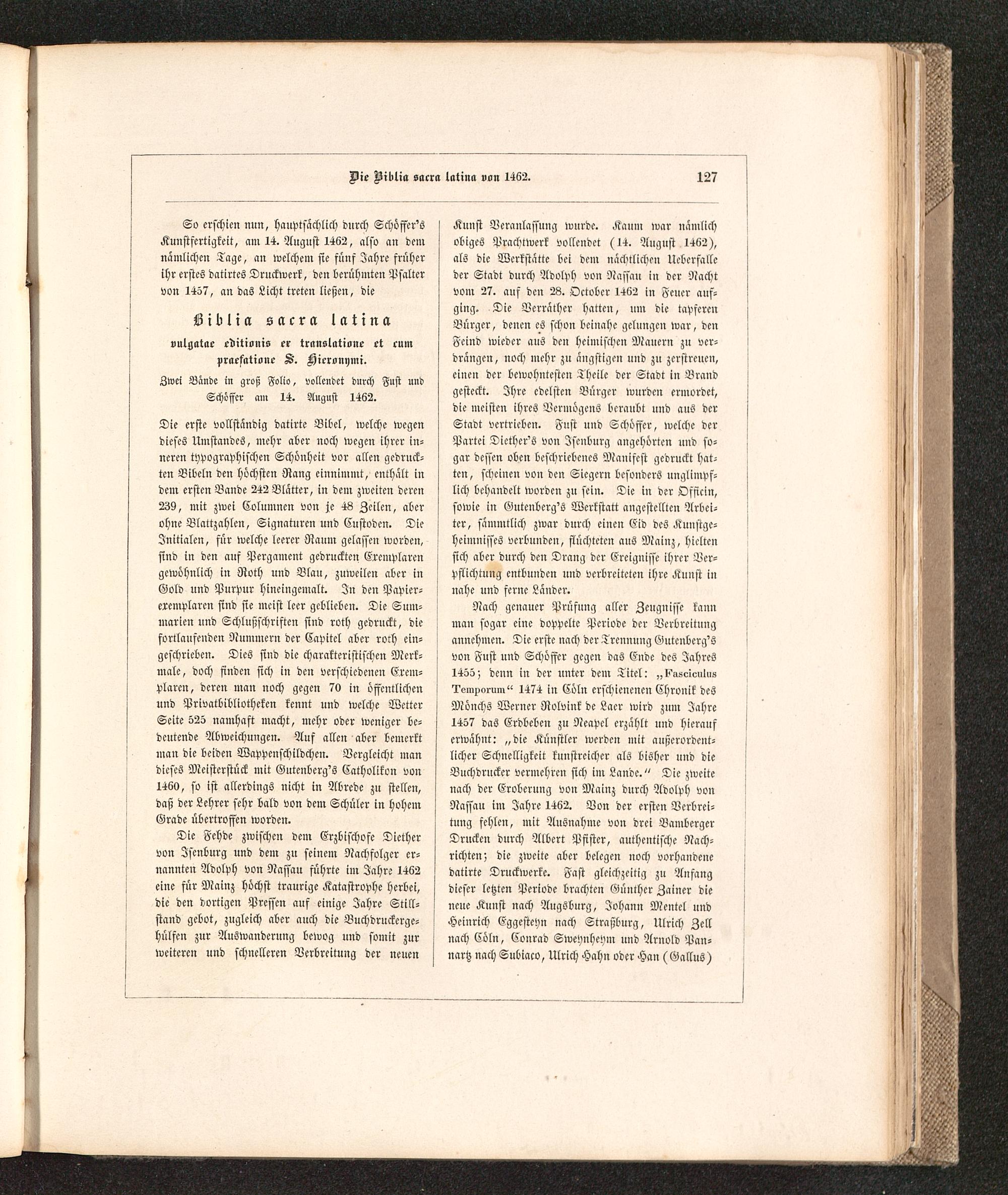 Die erste vollständig datirte Bibel, welche wegendieses Umstandcs, mehr aber noch wegen ihrer in-neren typographischen Schönheit vor allen gedruck-ten Bibeln den höchsten Rang einnimmt, enthalt indem ersten Bande 242 Blatter, in dem zweiten deren239, mit zwei Columucu von je 48 Zeilen, aberohne Blattzahlen, Signaturen uud Custoden. DieInitialen, für welche leerer Raum gelassen worden,sind in den anf Pergament gedruckten Eremplareugewöhnlich in Noth uud Blau, zuweilen aber inGold und Purpur hineingemalt. In den Papier -eremplarcn sind sie meist leer geblieben. Die Sum-marien und Schlußschriften sind roth gedruckt, diefortlaufenden Nummern der Capitel aber roch ein-geschrieben. Dies sind die charakteristischen Merk-male, doch finden sich in den verschiedenen Erem-plaren, deren man noch gegen 70 in öffentlichenund Privatbibliotheken kennt uud welche WetterSeite 525 namhaft macht, mehr oder weniger be-deutende Abweichungen. Auf allen aber bemerktman die beiden Wappcnschildchcn. Vergleicht mandieses Meisterstück mit Gutcnbcrg's Catholikon von1460, so ist allerdings nicht in Abrede zu stellen,daß der Lehrer sehr bald von dem Schüler in hohemGrade übertreffen worden.