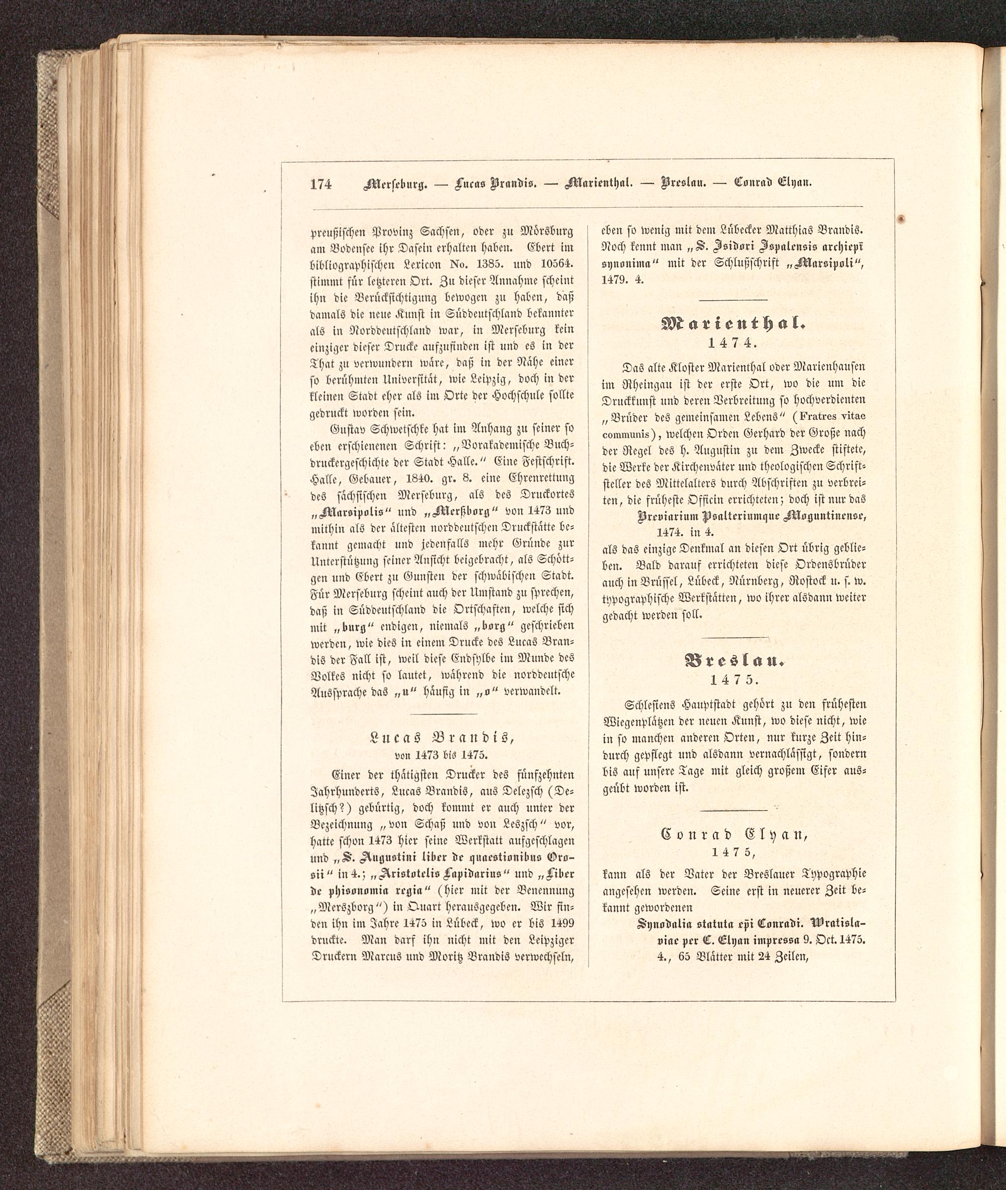 Einer der thatigsten Drucker des fünfzehntenJahrhunderts, Lncas Brandts, aus Delezsch (De-litzsch?) gebürtig, doch kommt er auch unter derBezeichnung „von Schaß und von Leszsch" vor,hatte schon 1473 hier seine Werkstatt aufgeschlagenund „S. Augustini libcr de nimcstioniblis Vro-sii" in 4.; „Aristotelis L»pid»rius" und „Fiberde phisonomiil rrgm" (hier mit der Benennung„Merszborg") in Quart herausgegeben. Wir fin-den ihn im Jahre 1475 in Lübeck , wo er bis 1499druckte. Man darf ihn nicht mit den Leipziger Truckern Marcus und Moritz Brandts verwechseln,