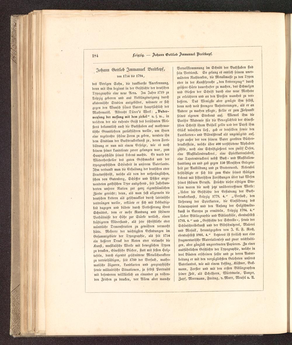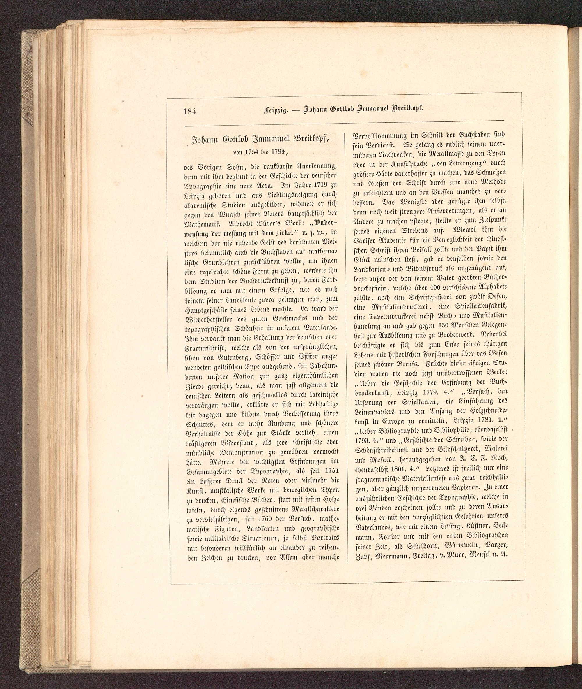 Vervollkommnung im Schnitt der Buchstaben sindsein Verdienst. So gelang es endlich seinem uner-müdeten Nachdenken, die Metallmasse zn den Typenoder in der Kunstsprache „ den Letternzeug" durchgrößere Härte dauerhafter zn machen, das Schmelzenund Gießen der Schrift durch eine neue Methodezu erleichtern und an den Pressen manches zu ver-bessern. Das Wenigste aber genügte ihm selbst,denn noch weit strengere Anforderungen, als er anAndere zu machen pflegte, stellte er zum Zielpunktseines eigenen Strebens aus. Wiewol ihm diePariser Akademie für die Beweglichkeit der chinesi-schen Schrift ihren Beifall zollte und der Papst ihmGlück wünschen ließ, gab er denselben sowie denLandkarten - und Bildnißdruck als ungenügend ans,legte anßer der von seinem Vater geerbten Bücher-druckofficiu, welche über 400 verschiedene Alphabetezählte, noch eine Schriftgießerei von zwölf Oefcn,eine Musikaliendruckerei, eine Spielkartenfabrik,eine Tapeteudruckerei nebst Buch - und Musikalien-handlung an und gab gegen 150 Menschen Gelegen-heit znr Ausbildung und zu Broderwcrb. Nebenbeibeschäftigte er sich bis zum Ende seines thätigenLebens mit historischen Forschuugcu über das Wesenseines schönen Berufs. Früchte dieser eifrigen Stu-dien waren die noch jetzt unübertroffenen Werke:„Ueber die Geschichte der Erfindung der Buch-druckerkuust, Leipzig 1779. 4." „Versuch, denUrsprung der Spielkarten, die Einführung dcsLeinenpapiers und den Anfang der Holzschneide-kunst in Europa zu ermitteln, Leipzig 1784. 4."„Ueber Bibliographie uud Vibliophilie, ebendaselbst1793. 4." und „Geschichte der Schreibe-, sowie derSchönschrcibeknnst und der Bildschnitzerei, Malereiund Mosaik, herausgegeben von I. C. F. Roch,ebendaselbst 1801. 4." Letzteres ist freilich mir einefragmentarische Materialienlese aus zwar reichhalti-gen, aber gänzlich ungeordneten Papieren. Zn einerausführlichen Geschichte der Typographie, welche indrei Bänden erscheinen sollte und zu deren Ausar-beitung er mit den vorzüglichsten Gelehrten unseresBaterlandes, wie mit einem Lcssing, Küstner, Bcck-mann, Forster und mit den ersten Bibliographenseiner Zeit, als Schclhorn, Würdtwein, Panzer,Zaps, Mecrmann, Freitag, v. Mnrr, Mensel u. A.