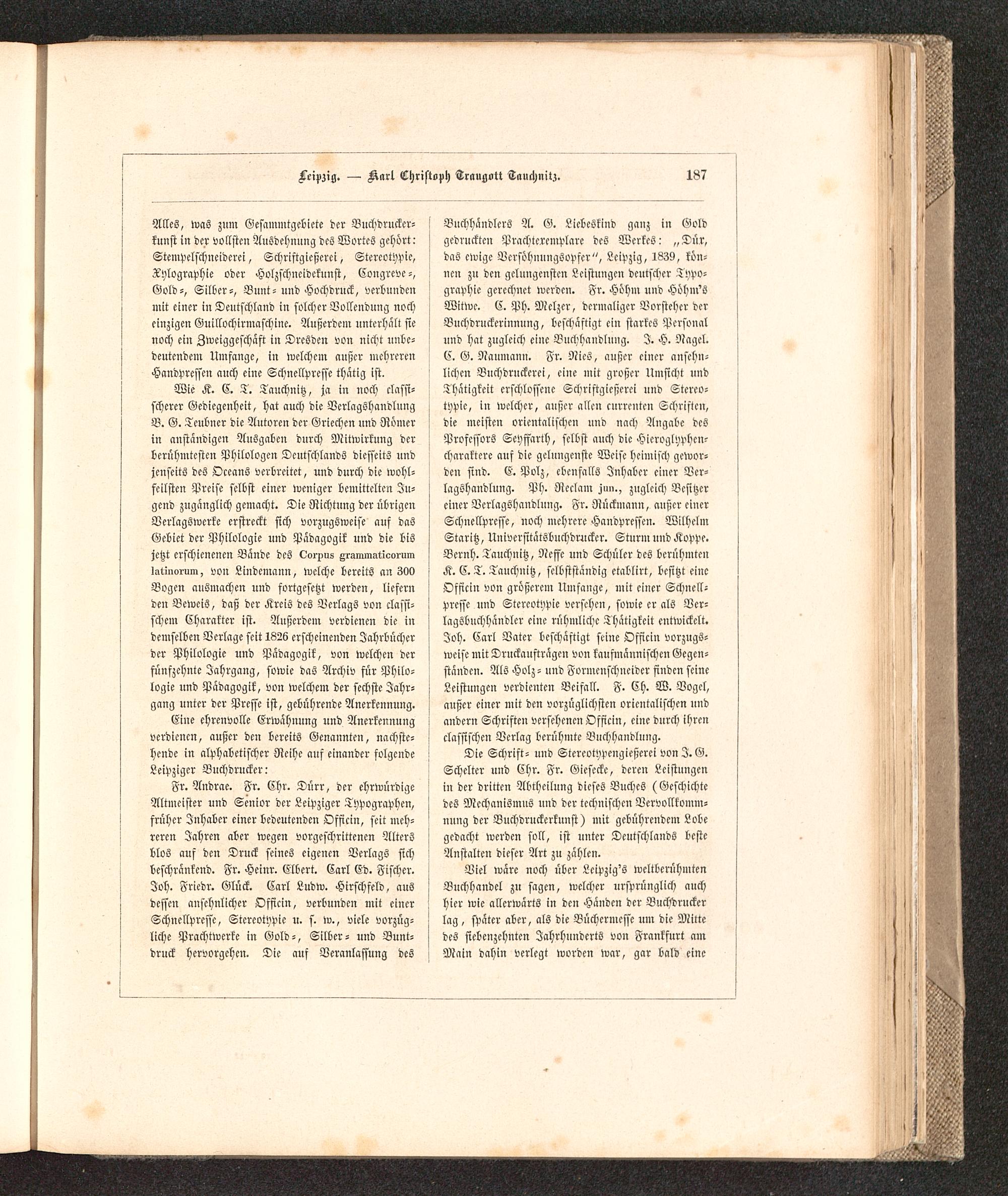 ! Buchhändlers A. G. Liebeskiud ganz in Goldgedruckten Prachtexemplare des Werkes: „Dur,das ewige VcrsöhuuugSopfer", Leipzig , 1839, kön-nen zu den gelungensten Leistungen deutscher Typo-graphie gerechnet werden. Fr. Höhin und Höhm'SWitwe. C. PH. Mclzer, dcrmaliger Vorsteher derVuchdruckerinnung, beschäftigt ein starkes Personalund hat zugleich eine Buchhandlung. I. H. Nagel.C. G. Naumann. Fr. Nies, außer einer ansehn-lichen Vnchdrnckcrei, eine mit großer Umsicht uudThätigkeit erschlossene Schriftgießerei und Stereo-typie, in welcher, außer allen currentcn Schriften,die meisten orientalischen und nach Angabe desProfessors Seyffarth, selbst auch die Hieroglyphen-charaktere auf die gelungenste Weise heimisch gewor-den sind. E. Polz, ebenfalls Inhaber einer Ver-lagShandluug. PH. Ncclam jm,., zugleich Besitzereiner VerlagShaudlung. Fr. Nückmann, außer einerSchnellpresse, noch mehrere Handpressen. WilhelmStaritz, UniversitätSbuchdruckcr. Sturm und Koppe.Beruh. Tauchnitz, Neffe und Schüler dcS berühmtenK.C.T. Tanchnitz, selbstständig ctablirt, besitzt eineOfficin von größerem Umfange, mit einer Schnell-presse und Stereotypie versehen, sowie er als Ver-lagSbuchhäudler eine rühmliche Thätigkeit entwickelt.Joh. Carl Vater beschäftigt seine Officin vorzugs-weise mit Druckaufträgen von kaufmännischen Gegen-ständen. Als Holz - und Formcnschneidcr finden seineLeistungen verdienten Beifall. F. Ch. W. Vogel,außer einer mit den vorzüglichsten orientalischen undandern Schriften versehenen Officin, eine durch ihrenclassischen Verlag berühmte Buchhandlung.