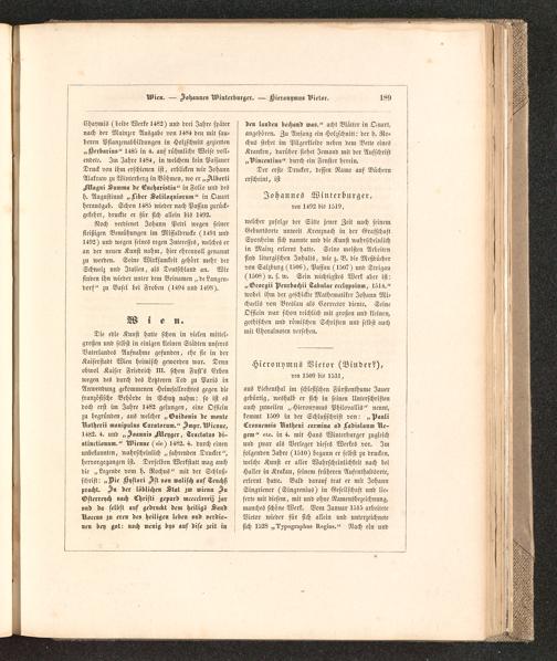 aus Licbcnthal im schlesischen Fürstenthnme Jauergebürtig, weshalb er sich in seinen Unterschriftenauch zuweilen „Hieronhmus Philovallis" nennt,kommt 1509 in der Schlnßschrift von: „PauliCrosncnsis Nutheni carmina ad Fadislaum Nc-gcm" etc. in 4. mit Hans Wintcrburgcr zugleichund zwar als Verleger dieses Werkes vor. Imsolgcndcn Jahre (1510) begann er selbst zn drucken,welche Knnst er aller Wahrscheinlichkeit nach beiHaller in Krakau , seinem früheren Aufenthaltsorte,erlernt hatte. Bald darauf trat er mit JohannSingricncr (Singreniuö) in Gesellschaft und lie-ferte mit diesem, mit und ohne NamcnSbczeichnnng,manches schöne Werk. Vom Januar 1515 arbeiteteVictor wieder für sich allein und uutcrzcichnctesich 1528 „l'^iograplms Hexius." Nach ein und