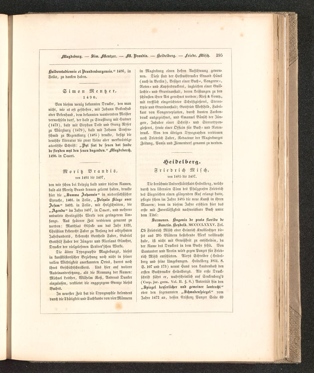 Sermones. Hugonis dc prato slorid» deSaintis . Beyde!!,. Z>iccc.ei^xxxv. Fol.Ob Friedrich Misch oder Heinrich ^inoblochtzer die-ses aus 235 Blattern bestehende Werk vollbrachthabe, ist nicht mit Gewißheit zn entscheiden, dader Name des Druckers in dem Buche fehlt. VonSantcmder und Arctin wird gegen Panzer für Fried-rich Misch entschiede». Aloys Schreiber (Heidel-berg und seine Umgebungen. Heidelberg 1811. 8.S. 107 und 173) nennt Hans von Landcnbach denersten Buchdrucker Heidelbergs . Als erste Druck-schrift führt er, wahrscheinlich auf Senkenberg's(Lors>. i'ur. xerm. Vol. 11. §. 8.) Autorität hiu den„Spiegel Kcyserlichcr und gemeiner lantrecht"oder den sogenannten „Schmabensvicgel" vomJahre 1472 an, dessen Eristenz Panzer Seite 69