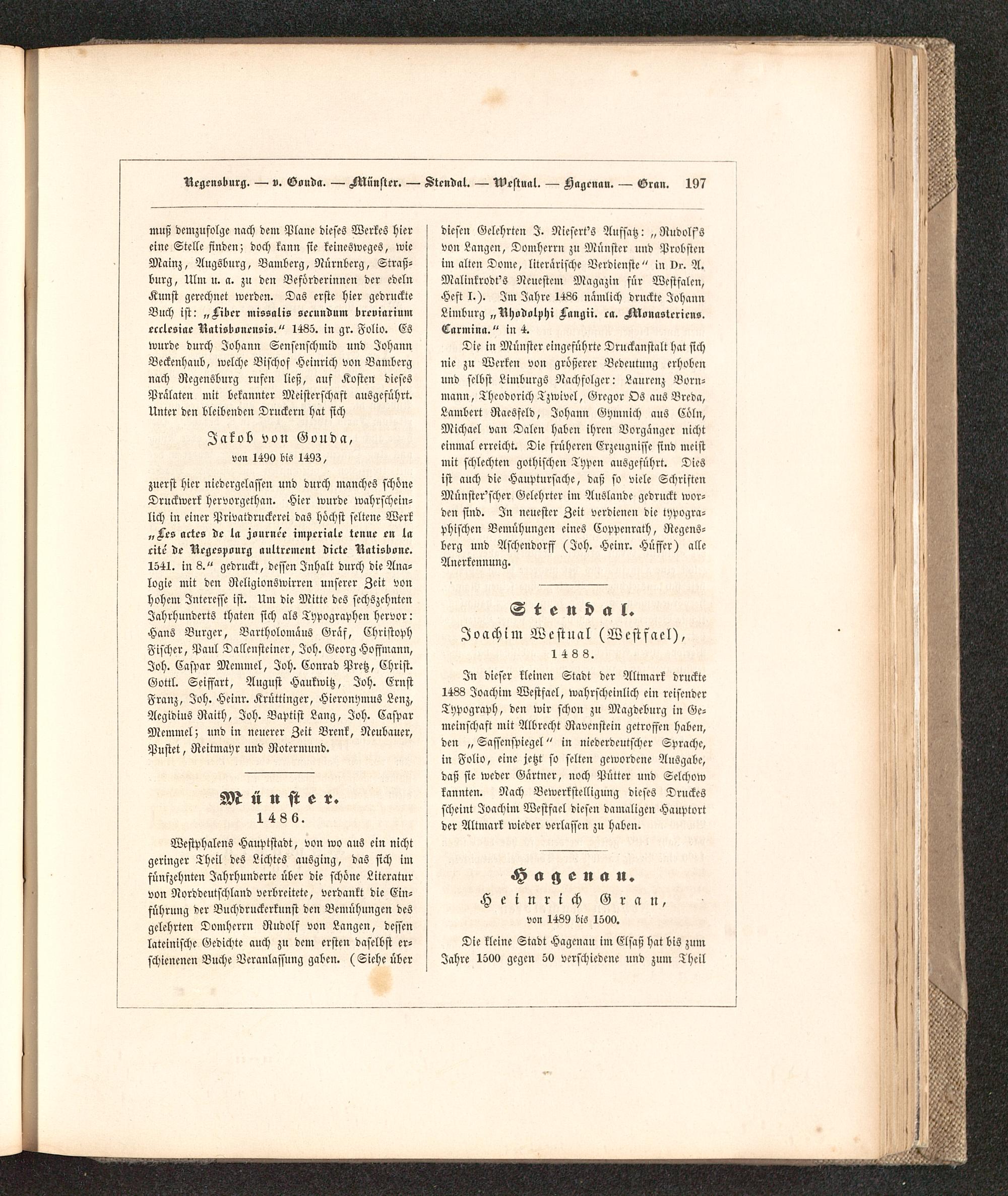 Westphalens Hauptstadt, von wo aus ein nichtgeringer Theil des Lichtes ausging, das sich imfünfzehnten Jahrhunderte über die schöne Literaturvon Norddeutschland verbreitete, verdankt die Ein-führung der Buchdruckerkunst den Bemühungen deSgelehrten Domherrn Rudolf von Langen , dessenlateinische Gedichte auch zu dem ersten daselbst er-schienenen Buche Veranlassung gaben. (Siehe über