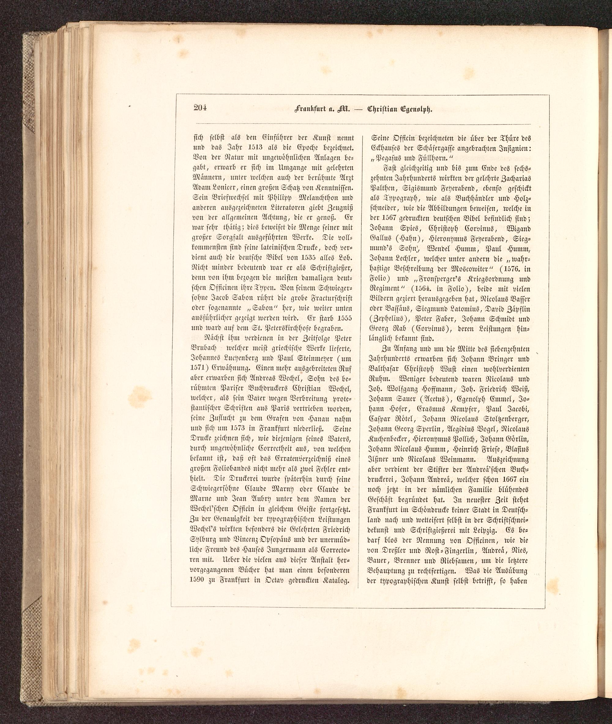 sich selbst als den Pinführer der Kunst nenntnnd daö Jahr 1513 als die Epoche bezeichnet.Von der Natur mit ungewöhnlichen Anlagen be-gabt, erwarb er sich im Umgänge mit gelehrtenMännern, unter welchen auch der berühmte ArztAdam Lonicer , einen großen Schatz von Kenntnissen.Sein Briefwechsel mit Philipp Melanchthon undanderen ausgezeichneten Litcratorcn giebt Zeugnißvon der allgemeinen Achtung, die er genoß. Erwar sehr thatig; dies beweiset die Menge seiner mitgroßer Sorgfalt ausgeführten Werke. Die voll-kommensten sind seine lateinischen Drucke, doch ver-dient mich die deutsche Bibel von 1535 alles Lob.Zcicht minder bedeutend war er als Schristgicßer,denn von ihm bezogen die meisten damaligen dent-schen Officinen ihre Tvpen. Von seinem Schwieger-söhne Jacob Sabon rührt die grobe Fractnrschrifloder sogenannte „Sabon" her, wie weiter untenausführlicher gezeigt werden wird. Er starb 1555und ward auf dem St. PeterSkirchhofe begraben.