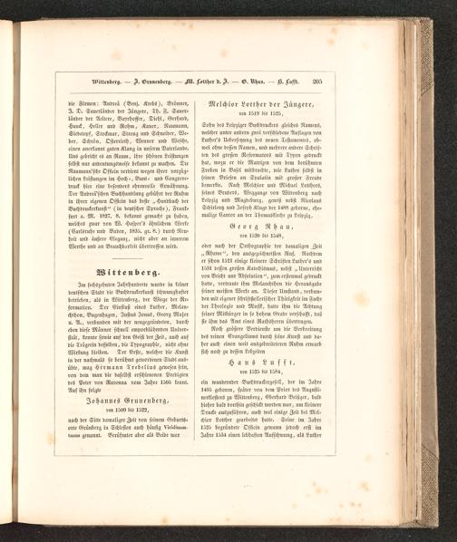 Im scchSzehnten Jahrhunderte wurde in keinerdeutschen Stadt die Buchdruckerkunst schwunghafterbetrieben, als iu Wittcnberg, der Wiege der Re-formation. Der Einfluß eines Luther, Melan-chthon, Bugenhagcn, Justus Jouas, Georg Majoru. A., verbunden mit der neugegründeten, durcheben diese Männer schnell emporblühenden Univer-sität, konnte sowie auf den Geist der Zeit, auch aufdie Trägerin desselben, die Typographie, nicht ohneWirkung bleiben. Der Erste, welcher die Kunstin der nachmals so berühmt gewordenen Stadt aus-übte, mag Hermann Trebelius gewesen sein,von dem man die daselbst erschienenen Predigtendes Peter von Navenna vom Jahre 1505 kennt.Alts ihn folgte