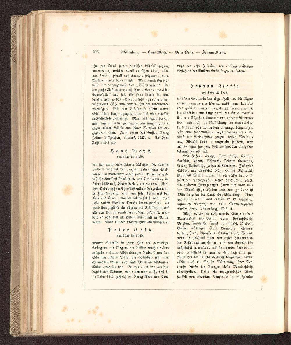 Mit Johann Krafft , Peter Seitz, ClemensSchleich, Lorcnz Schwenk, Johann Gormann,Lorenz Seuberlich, ZachariaS Lehmann, ZachariasSchürer und Matthias Götz, Hanns Schwerte!,Matthias Welack schließt sich die Reihe der denk-würdigen Typographen dieser historischen Stadt.Die spateren Zunftgcnossen haben sich nicht überdas Mittelmäßige erhoben und heut zu Tage istWitteuberg für die Kunst ohne Bedeutung. Einenausftlhrlichercn Bericht enthalt E. G. Eichsfeld,historische Nachricht von allen WittenbcrgischenBuchdrucker». Witteuberg, 1746. 4.