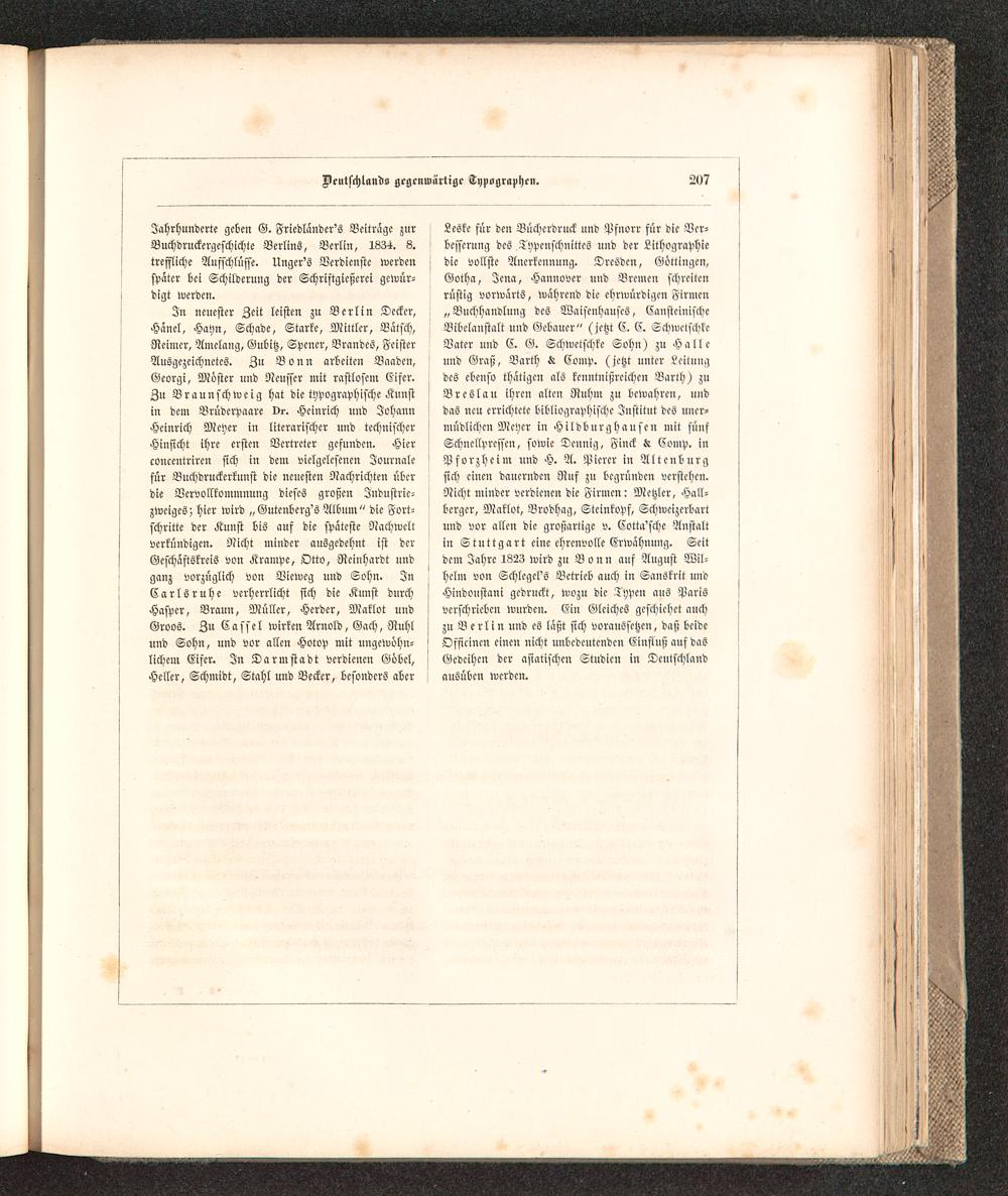 In neuester Zeit leisten zu Berlin Decker,Hänel, Hayn, Schade, Starke, Mittler, Bätsch,Reimer, Amelang, Gubitz, Spener , BrandeS, FeisterAusgezeichnetes. Zn Bonn arbeiten Baaden,Georgi, Möster und Ncusser mit rastlosem Eiser.Zu Braunschwcig hat die typographische Kunstin dein Vrüdcrpaare vr. Heinrich und JohannHeinrich Meyer in literarischer und technischerHinsicht ihre ersten Vertreter gefunden. Hierconccntriren sich in dem vielgelesenen Journalesür Buchdruckerkunst die neuesten Nachrichten überdie Vervollkommnung dieses großen Industrie-zweiges; hier wird „Gutenberg/s Album" die Fort-schritte der Kunst bis auf die spateste Nachweltverkündigen. Nicht minder ausgedehnt ist derGeschäftskreis von Krampe, Otto, Reinhardt undganz vorzüglich von Vieweg und Sohn. InCarls ruhe verherrlicht sich die Kunst durchHaspcr, Braun, Müller, Herder, Maklot undGrooö. Zu Cassel wirken Arnold, Gaeh, Nuhlund Sohn, und vor allen Hotop mit ungewöhn-lichem Eifer. In Darmstadt verdienen Gobel,Heller, Schmidt, Stahl und Becker, besonders aber