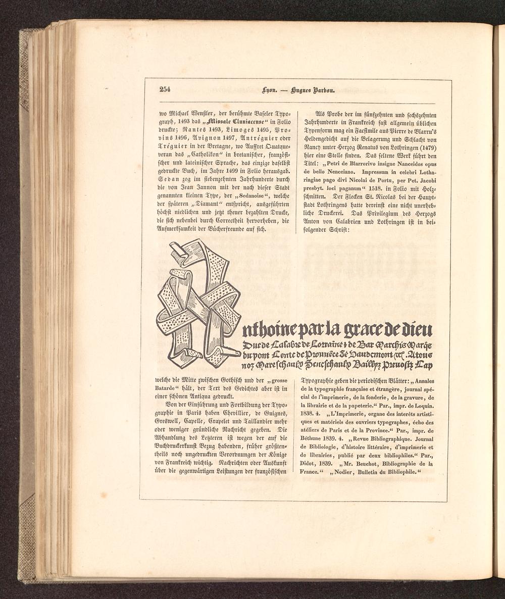 xresdvt. loci pnx-iuum" 1518. in Folio mit Holz-schnitten. Der Flecken St. NicolaS bei der Haupt-stadt Lothringens hatte dereinst eine nicht unerheb-liche Druckerei. Das Privilegium des HerzogsAnton von Calabrien und Lothringen ist in bei-folgender Schrift: