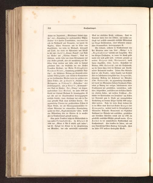Wie bekannt, erscheint in Constantinopel eineArt Moniteur unter dem Titel „Wekaje" d. h.„Begebenheiten" türkisch und französisch. Vonden übrigen Ortschaften, in denen die Kunst geübtwurde oder noch geübt wird, verdienen genannt zuwerden' Belgrad 1552; Adrianopel , durchJuden eingeführt, 1554; Jassy, Hauptstadt derMoldau, 1633; Salonichi, das alte Thessalonich,wo die Juden schon 1515 die Psalmen und Sprich-wörter Salomonis druckten. Jehuda Ven Ghedaliahieß der erste Drucker, dessen Familie das Geschäftüber ein Jahrhundert fortgeführt hat; Tergowischt,ehemalige Residenz des Hospodars der Walachei,1710; Bukarescht, die gegenwärtige Hauptstadt,soll durch den Woywoden Johann Constantin Bessa-rabas zu Anfang des vorigen Jahrhunderts einenDrnckapparat mit griechischen, walachischen, russi-schen , bulgarischen , arabischen und türkischen Schris-ten erhalten haben, mit welchen Dosithens „Ge-schichte der Partriarchen von Jerusalem" auf Kostendcö Convents znm h. Grabe zur unentgeldlichenVertheilung an fromme Pilger daselbst 1690 ausge-führt worden. Nahe bei dieser Stadt befindet sichin der Mitte eines Sees das Kloster Snagof oderSynaguphu, welches durch die Freigebigkeit desWoywoden Bessaraba Brancowani der ErzbischofAnthimns der Walachei mit arabischen, griechischennnd illyrischen Schriften versah nnd wo 1701 eingriech isch - arabisches Missale gedruckt wurde. OrtaKaiwai in der unmittelbaren Nachbarschaft vonConstantinopel. Hier druckten die Juden, wie aus! dem Oppenheimcr'schen Kataloge hervorgeht, schon! im Jahre 1717 mehrere theologische Werke.
