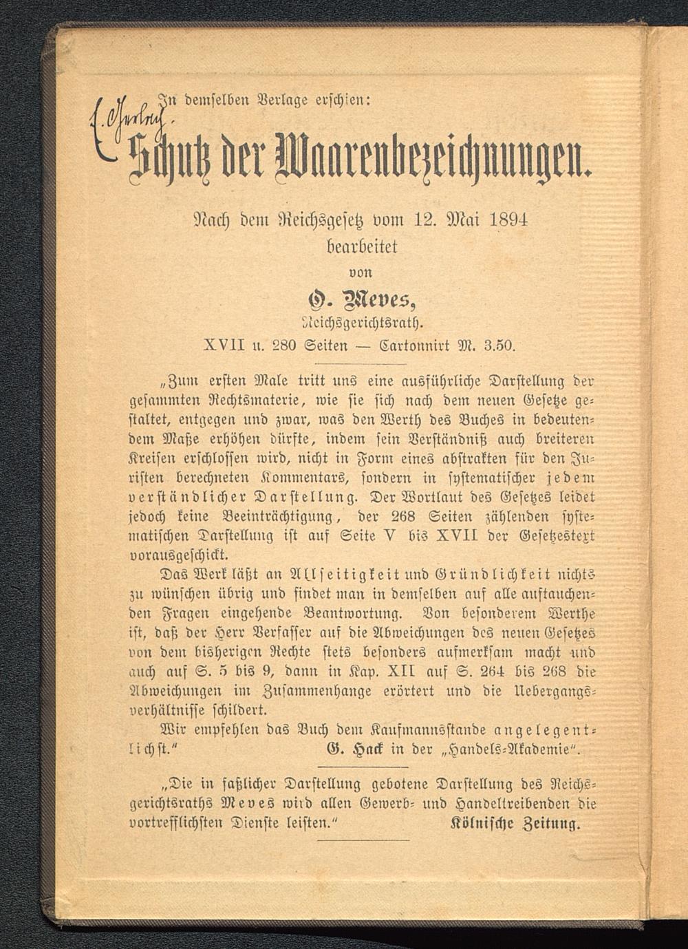 Das Werk läßt an Al.lseitigkeit und Gründlichkeit nichtszu wünschen übrig und findet man in demselben auf alle auftauchen-den Fragen eingehende Beantwortung. Von besonderem Wertheist, daß der Herr Verfasser auf die Abweichungen des neuen Gesetzesvon dem bisherigen Rechte stets besonders aufmerksam macht undanch auf S. 5 bis 9, dann in Kap. XII auf S. 264 bis 268 dieAbweichungen im Zusammenhange erörtert und die UebergangS-verhültnisse schildert.