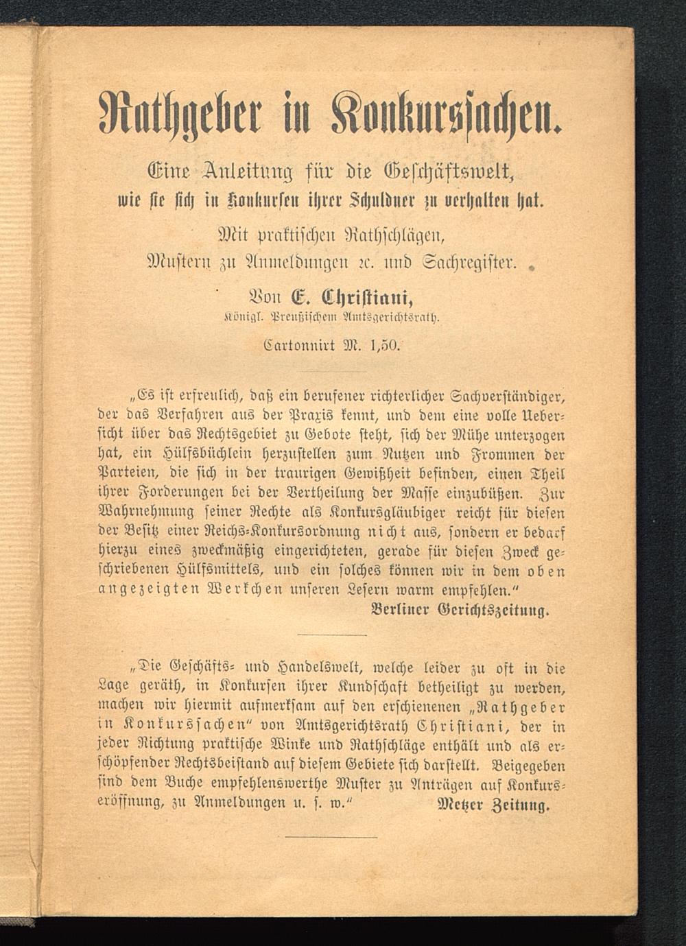 „Die Geschäfts- und Handelswelt, welche leider zu oft in dieLage geräth, in Konkursen ihrer Kundschaft betheiligt zu werden,machen wir hiermit aufmerksam auf den erschienenen „Rath geb erin Konkurssachen" von Amtsgerichtsrath Christiani, der injeder Richtung praktische Winke und Rathschläge enthält und als er-schöpfender Rechtsbeistand auf diesem Gebiete sich darstellt. Beigegebensind dem Buche empfehlenswerthe Muster zu Anträgen auf Konkurs-eröffnung, zu Anmeldungen u. s> w." Mchcr Zeitung.