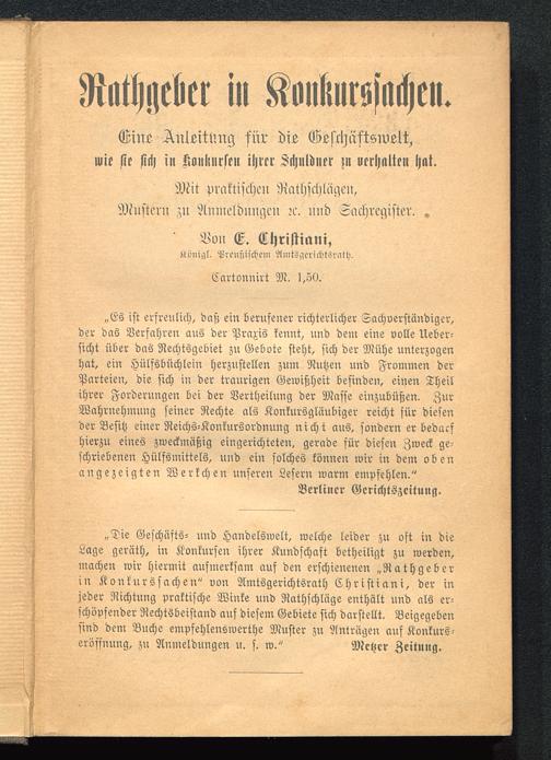 „Es ist erfreulich, daß ein berufener richterlicher Sachverständiger,der das Verfahren aus der Praxis kennt, und dem eine volle Ueber-sicht über das Nechtsgebiet zu Gebote steht, sich der Mühe unterzogenhat, ein Hülfsbüchlein herzustellen zum Nutzen und Frommen derParteien, die sich in der traurigen Gewißheit befinden, einen Theilihrer Forderungen bei der Vertheilnng der Masse einzubüßen. ZurWahrnehmung seiner Rechte als Konkursgläubiger reicht für diesender Besitz einer Neichs-Konkursordnung nicht ans, sondern er bedarfhierzu eines zweckmäßig eingerichteten, gerade für diesen Zweck ge-schriebenen Hülfsmittels, und ein solches können wir in dem obenangezeigten Werkchen unseren Lesern warm empfehlen."