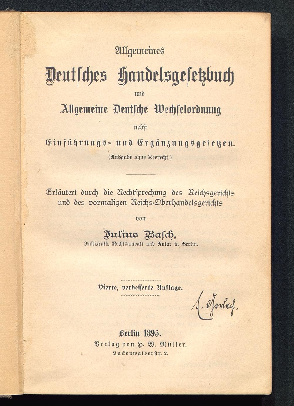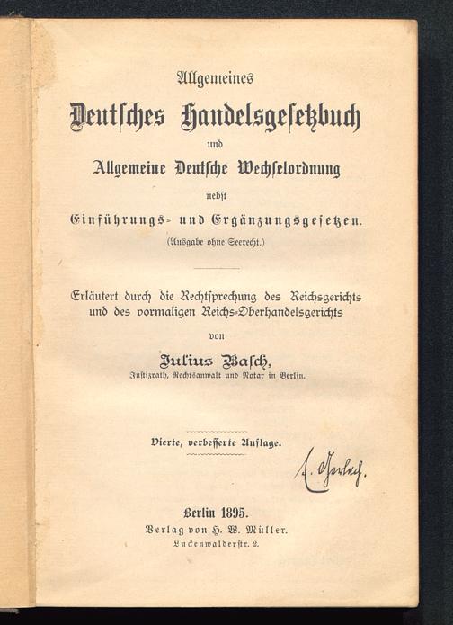 Allgemeines Deutsches Handelsgesetzbuch UNdAllgemeine Deutsche WechselordnungnebstEinfnhrungs- und Ergänzungsgesetzen.(Ausgabe ohne Scerecht,)Erläutert durch die Rechtsprechung des Reichsgerichtsund des vormaligen Reichs-OberhandelsgerichtsvonJulius Mcrsch,Iustizrcith, Rcchtsanwalt und Notar in Berlin .vierte, verbesserte Auflage.Serlin 1893.Verlag von H. W. Müller.L ii ckenwaldcrstr. S.