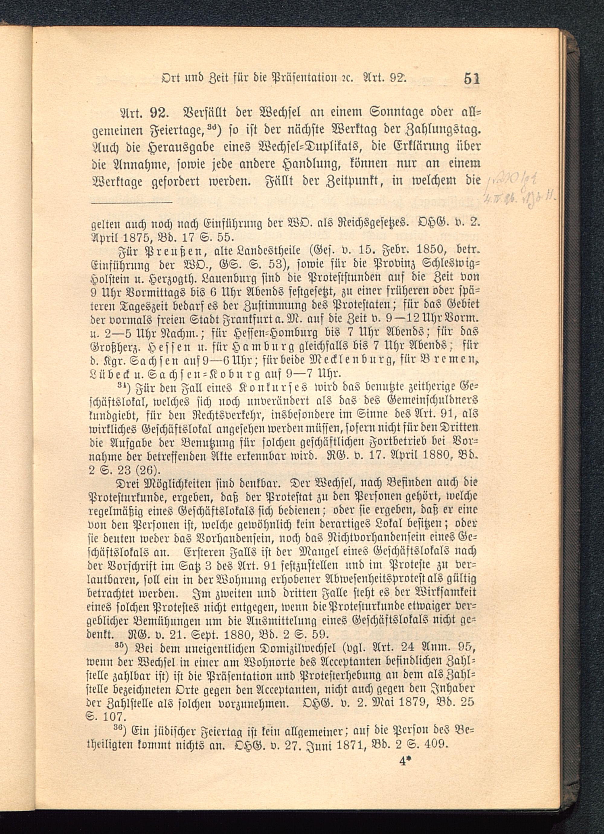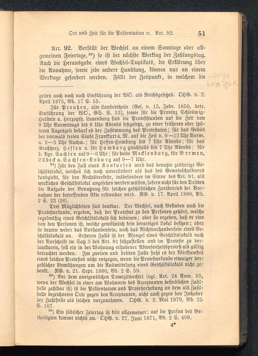 Art. 92. Verfällt der Wechsel cm einem Sonntage oder all-gemeinen Feiertage, ^) so ist der nächste Werktag der Zahlungstag.Auch die Herausgabe eines Wechsel-Duplikats, die Erklärung überdie Annahme, sowie jede andere Handlung, können nur an einemWerktage gefordert werden. Fällt der Zeitpunkt, in welchem die