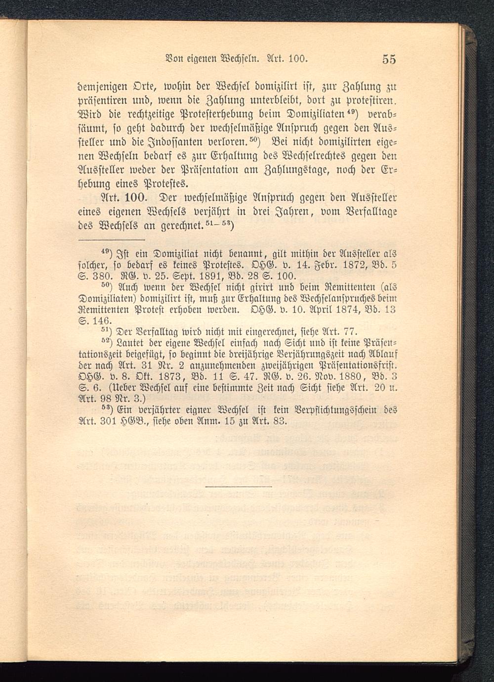 Lautet der eigene Wechsel einfach nach Sicht nud ist keine Präsen-tationszeit beigefügt, so beginnt die dreijährige Verjährungszcir nach Ablaufder nach Art. 31 Nr. 2 anzunehmenden zweijährigen Präsentationsfrist.OHG. v. 8. Okt. 1873, Bd. 11 S. 47. RG. v. 26. Nov. 1880, Bd. 3S. 6. (Ueber Wechsel auf eine bestimmte Zeit nach Sicht siehe Art. 20 u.Art. 08 Nr. 3.)