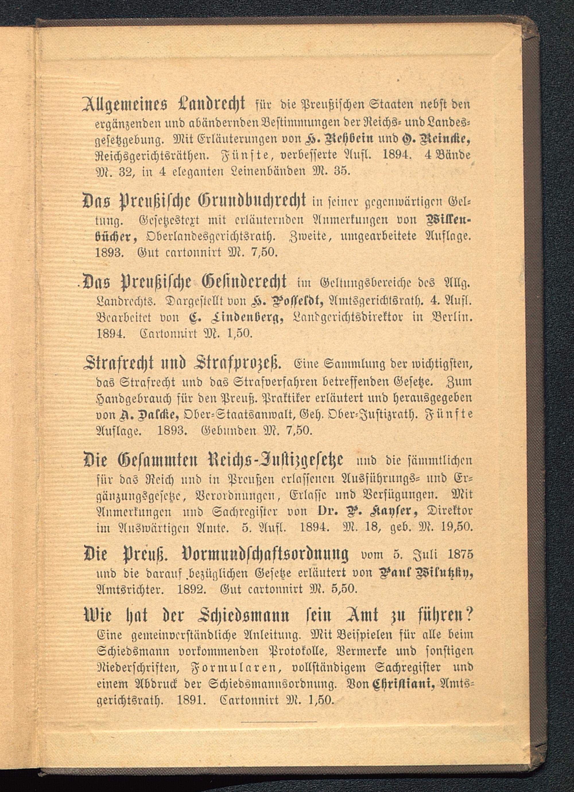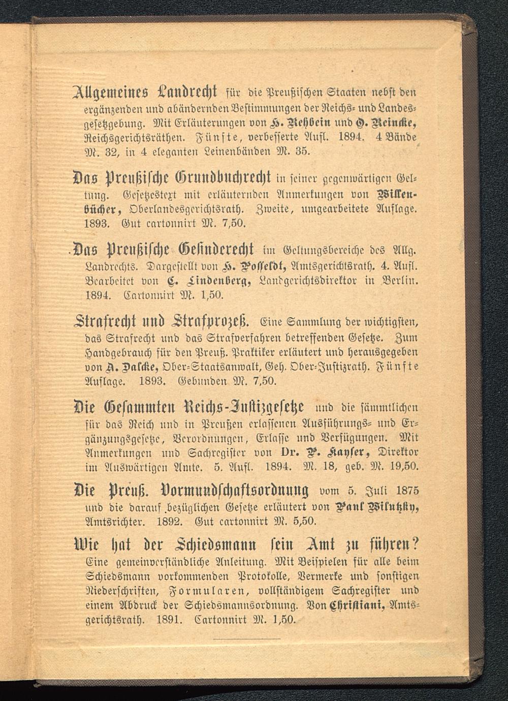 Allgemeines Landrecht für die Preußischen Staaten nebst denergänzenden nnd abändernden Bestimmungen der Reichs- und Landes-gesetzgebung. Mit Erläuterungen von K. Nchbcin und H. Iteincke,Reichsgerichtsräthen. Fünfte, verbesserte Ansl. 1894. 4 BändeM. 32, in 4 elegante» Leinenbänden M. 36.