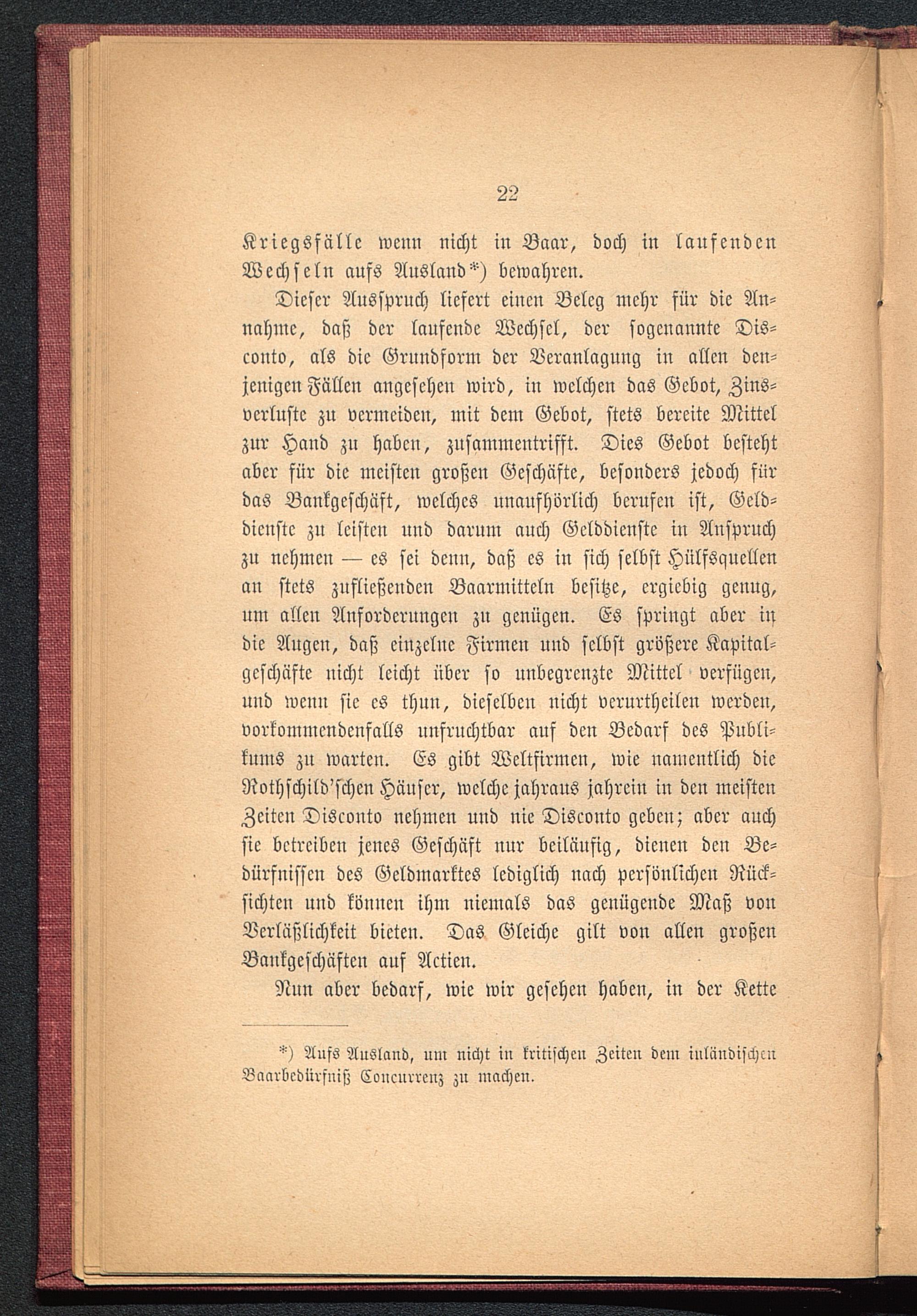 Dieser Ausspruch liefert einen Beleg mehr für die An-nahme, daß der laufende Wechsel, der sogenannte Dis-conto, als die Grundform der Veranlagung in allen den-jenigen Fällen angesehen wird, in welchen das Gebot, Zins-verluste zu vermeiden, mit dem Gebot, stets bereite Mittelzur Hand zu haben, zusammentrifft. Dies Gebot bestehtaber für die meisten großen Geschäfte, besonders jedoch fürdas Bankgeschäft, welches unaufhörlich berufen ist, Geld-dienste zu leisten und darum auch Gclddicnstc in Anspruchzu nehmen — es sei denn, daß es in sich selbst Hülfsquellenan stets zufließenden Baarmitteln besitze, ergiebig genug,um allen Anforderungen zu genügen. Es springt aber indie Augen, daß einzelne Firmen und selbst größere Kapital-geschäfte nicht leicht über so unbegrenzte Mittel verfügen,und wenn sie es thun, dieselben nicht vcrurtheilen werden,vorkommendenfalls unfruchtbar aus den Bedarf des Publi-kums zu warten. Es gibt Wcltfirmcn, wie namentlich dieNothschild'schcn Häuser, welche jahraus jahrein in den meistenZeiten Disconto nehmen und nie Disconto geben; aber auchsie betreiben jenes Geschäft nur beiläufig, dienen den Be-dürfnissen des Geldmarktes lediglich nach persönlichen Rück-sichten und können ihm niemals das genügende Maß vonVerläßlichkeit bieten. Das Gleiche gilt von allen großenBankgeschäften auf Actien.