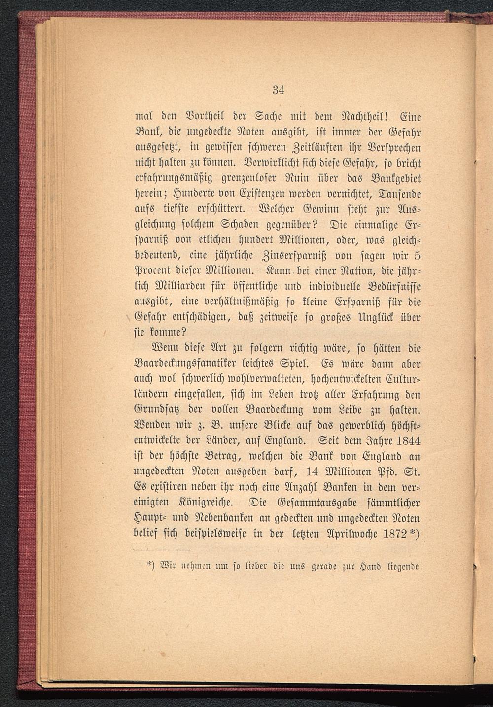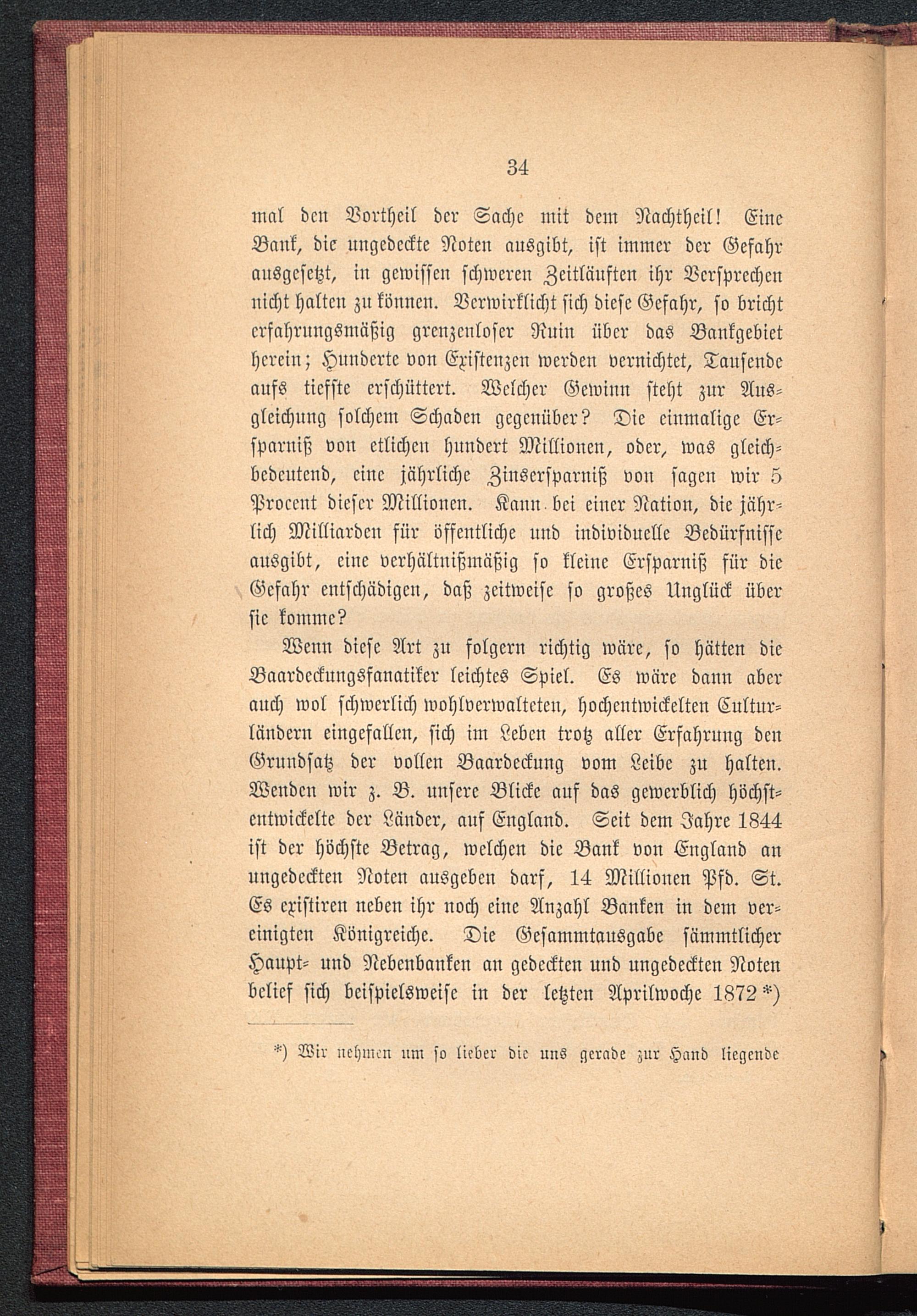 mal dcn Vortheil der Sache mit dem Nachtheil! EineBank, die ungedeckte Noten ausgibt, ist immer der Gefahrausgesetzt, in gewissen schweren Zeitläuften ihr Versprechennicht halten zu können. Verwirklicht sich diese Gefahr, so brichtcrfahrungsmäßig grenzenloser Ruin über das Bankgebictherein; Hunderte von Existenzen werden vernichtet, Tausendeaufs tiefste erschüttert. Welcher Gewinn steht zur Aus-gleichung solchem Schaden gegenüber? Die einmalige Er-sparniß von etlichen hundert Millionen, oder, was gleich-bedeutend, eine jährliche Zinscrsparniß von sagen wir 5Proccnt dieser Millionen. Kann bei einer Nation, die jähr-lich Milliarden für öffentliche und individuelle Bedürfnisseausgibt, eine vcrhältnißmäßig so kleine Ersparniß für dieGefahr entschädigen, daß zeitweise so großes Unglück übersie komme?