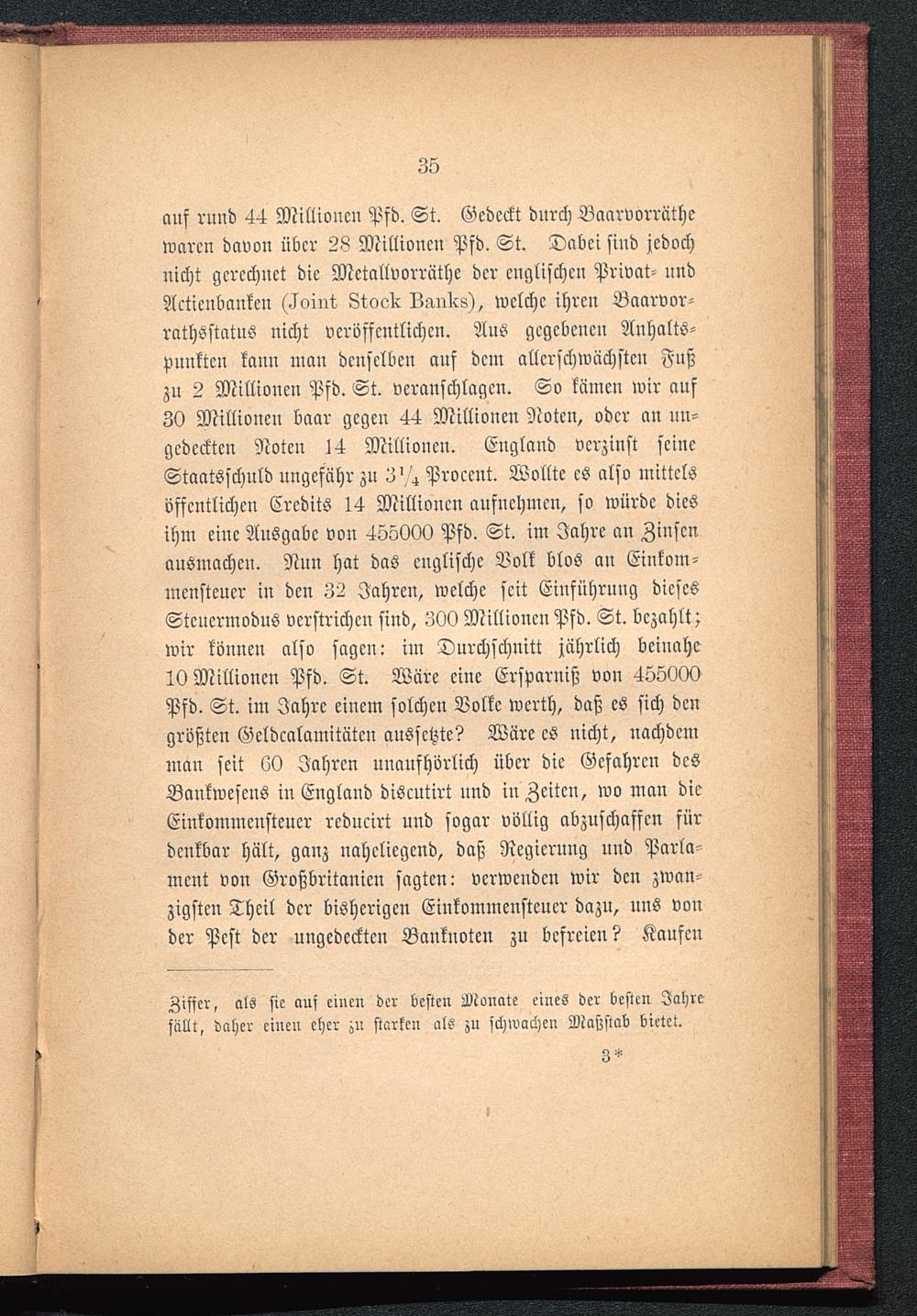 auf rund 44 Millionen Pfd. St. Gedeckt durch Baarvorräthcwaren davon über 28 Millionen Pfd. St. Dabei sind jedochnicht gerechnet die Metallvorräthe der englischen Privat- undActicnbaickcn (ckoint 8 toak Lanirs), welche ihren Baarvor-rathsstatnS nicht veröffentlichen. Aus gegebenen Anhalts-pnnktcn kann man denselben auf dem allcrschwächstcn Fußzu 2 Millionen Pfd. St. veranschlagen. So kämen wir auf30 Millionen baar gegen 44 Millionen Noten, oder an un-gedeckten Noten l4 Millionen. England verzinst seineStaatsschuld ungefähr zu 3' 4 Proccnt. Wollte es also mittelsöffentlichen Credits 14 Millionen aufnehmen, so würde diesihm eine Ausgabe von 455000 Pfd. St. im Jahre an Zinsenausmachen. Nun hat das englische Volk blos an Einkom-mensteuer in den 32 Jahren, welche seit Einführung diesesSteucrmodus verstrichen sind, 300 Millionen Pfd. St. bezahlt;wir können also sagen: im Durchschnitt jährlich beinahe10 Millionen Pfd. St. Wäre eine Ersparniß von 405000Pfd. St. im Jahre einem solchen Volke werth, daß es sich dengrößten Geldcalamitätcn aussetzte? Wäre es nicht, nachdemman seit 60 Jahren unaufhörlich über die Gefahren desBankwesens in England discutirt und in Zeiten, wo man dieEinkommensteuer reducirt und sogar völlig abzuschaffen fürdenkbar hält, ganz naheliegend, daß Regierung und Parla-ment von Großbritanicn sagten: verwenden wir den zwan-zigsten Theil der bisherigen Einkommensteuer dazu, uns vonder Pest der ungedeckten Banknoten zu befreien? Kaufen