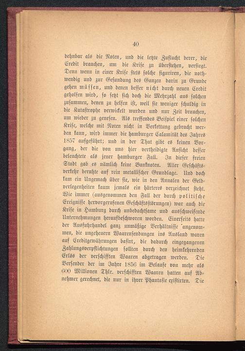 dehnbar als die Noten, und die letzte Zuflucht derer, dieCredit brauchen, um die Krise zu überstehen, versiegt.Denn wenn in einer Krise stets solche figurireu, die noth-wendig und zur Gesundung des Ganzen darin zu Grundegehen müssen, und denen besser nicht durch neuen Creditgeholfen wird, so setzt sich doch die Mehrzahl aus solchenzusammen, denen zu helfen ist, weil sie weniger schuldig indie Katastrophe verwickelt wurden und nur Zeit brauchen,um wieder zu genesen. Als treffendes Beispiel einer solchenKrise, welche mit Noten nicht in Verkettung gebracht wer-den kann, wird immer die Hamburger Calamität des Jahres1857 aufgeführt; und in der That gibt es keinen Vor-gang, der die von uns hier vertheidigte Ansicht besserbeleuchtete als jener Hamburger Fall. In dieser freienStadt gab es nämlich keine Banknoten. Aller Geschäfts-verkehr beruhte auf rein metallischer Grundlage. Und dochkam ein Ungemach über sie, wie in den Annalen der Geld-verlegenheiten kaum jemals ein härteres verzeichnet steht.Wie immer (ausgenommen den Fall der durch politischeEreignisse hervorgerufenen Geschäftsstörnngcn) war auch dieKrise in Hamburg durch »»bedachtsame und ausschweifendeUnternehmungen heraufbeschworen worden. Einerseits hatteder Ausfuhrhandel ganz unmäßige Verhältnisse 'angenom-men, die ungeheuern Waarcnscndnngcn ins Ausland warenauf Crcditgcwührungcn basirt, die dadurch eingegangenenZahlungsverpflichtungen sollten durch den heimkehrendenErlös der verschifften Waaren abgetragen werden. DieVersender der im Jahre 1856 im Belaufe von mehr als600 Millionen Thlr. verschifften Waaren hatten auf Ab-nehmer gerechnet, die nur in ihrer Phantasie cxistirten. Die