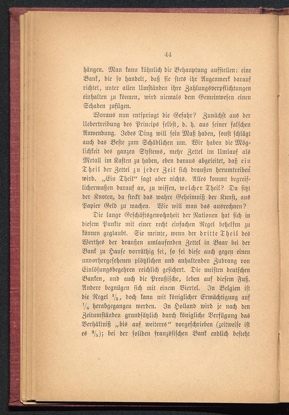 Die lange Gcschäftsgcwohnhcit der Nationen hat sich indiesem Punkte mit einer recht einfachen Regel behelfen zukönnen geglaubt. Sie meinte, wenn der dritte Theil desWerthes der draußen umlaufenden Zettel in Baar bei derBank zu Hause vorräthig sei, so sei diese auch gegen einenunvorhergesehenen plötzlichen und anhaltenden Zudrang vonEinlösnngsbcgehrcn reichlich gesichert. Die meisten deutschenBanken, und auch die Preußische, leben auf diesem Fuß.Andere begnügen sich mit einem Viertel. In Belgien istdie Regel doch kann mit königlicher Ermächtigung auf'Z hcrabgegangcn werden. In Holland wird je nach denZcitnmständcn grundsätzlich durch königliche Verfügung dasVerhältniß „bis auf weiteres" vorgeschrieben (zeitweise istes 2/z); bei der soliden französischen Bank endlich besteht