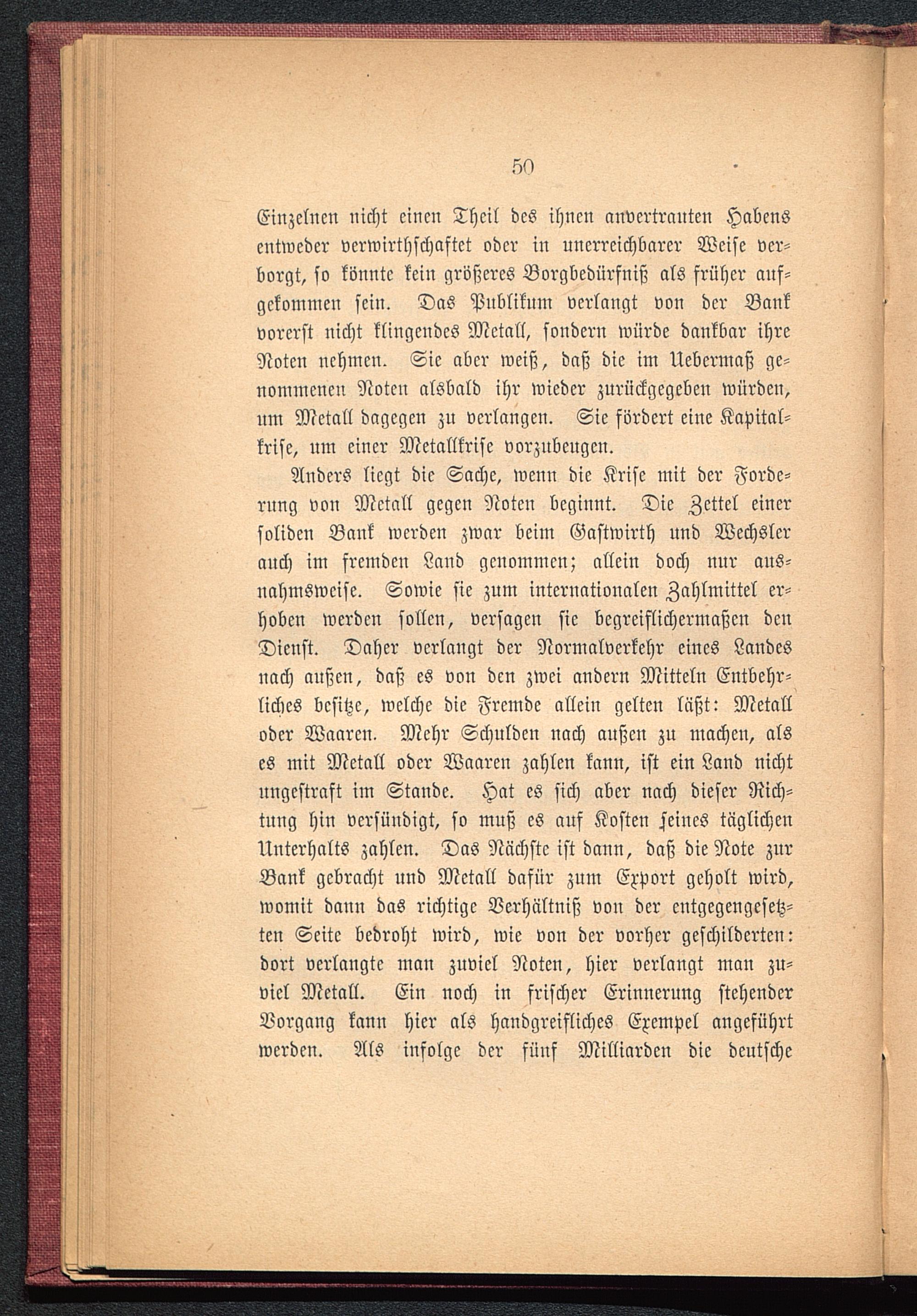 Anders liegt die Sache, wenn die Krise mit der Forde-rung von Metall gegen Noten beginnt. Die Zettel einersoliden Bank werden zwar beim Gastwirth und Wechslerauch im fremden Land genommen; allein doch nur aus-nahmsweise. Sowie sie zum internationalen Zahlmittel er-hoben werden sollen, versagen sie bcgreislichermaßen denDienst. Daher verlangt der Normalverkehr eines Landesnach außen, daß es von den zwei andern Mitteln Entbehr-liches besitze, welche die Fremde allein gelten läßt: Metalloder Waaren. Mehr Schulden nach außen zu machen, alses mit Metall oder Waaren zahlen kann, ist ein Land nichtungestraft im Stande. Hat es sich aber nach dieser Rich-tung hin versündigt, so muß es auf Kosten seines täglichenUnterhalts zahlen. Das Nächste ist dann, daß die Note zurBank gebracht und Metall dafür zum Export geholt wird,womit dann das richtige Verhältniß von der entgegengesetz-ten Seite bedroht wird, wie von der vorher geschilderten:dort verlangte man zuviel Noten, hier verlangt man zu-viel Metall. Ein noch in frischer Erinnerung stehenderVorgang kann hier als handgreifliches Exempel angeführtwerden. Als infolge der fünf Milliarden die deutsche