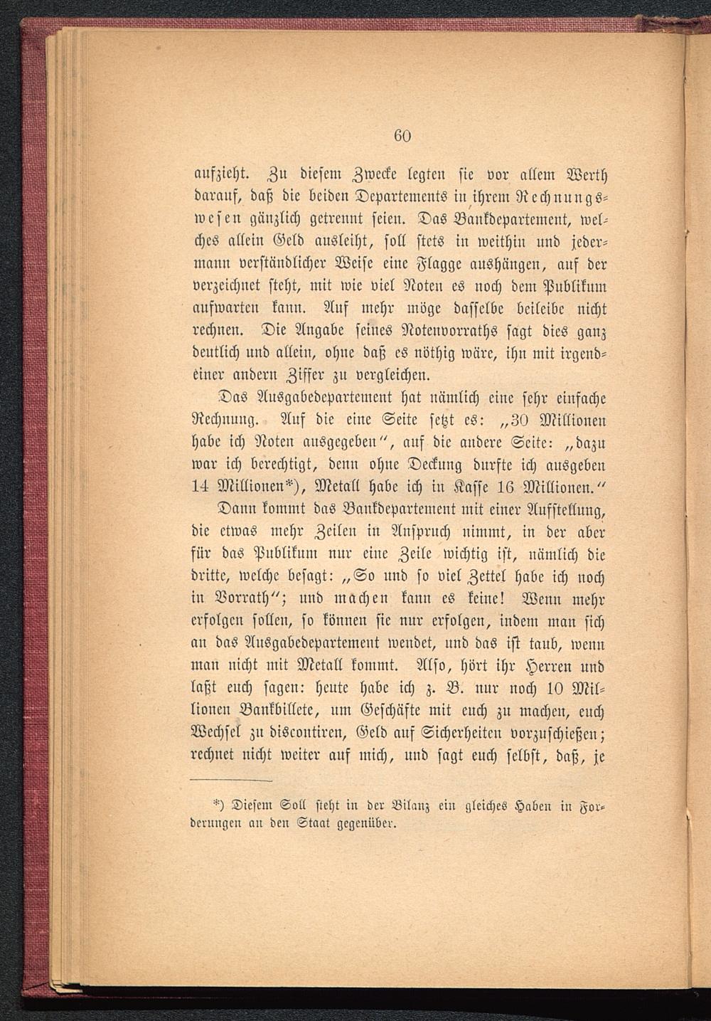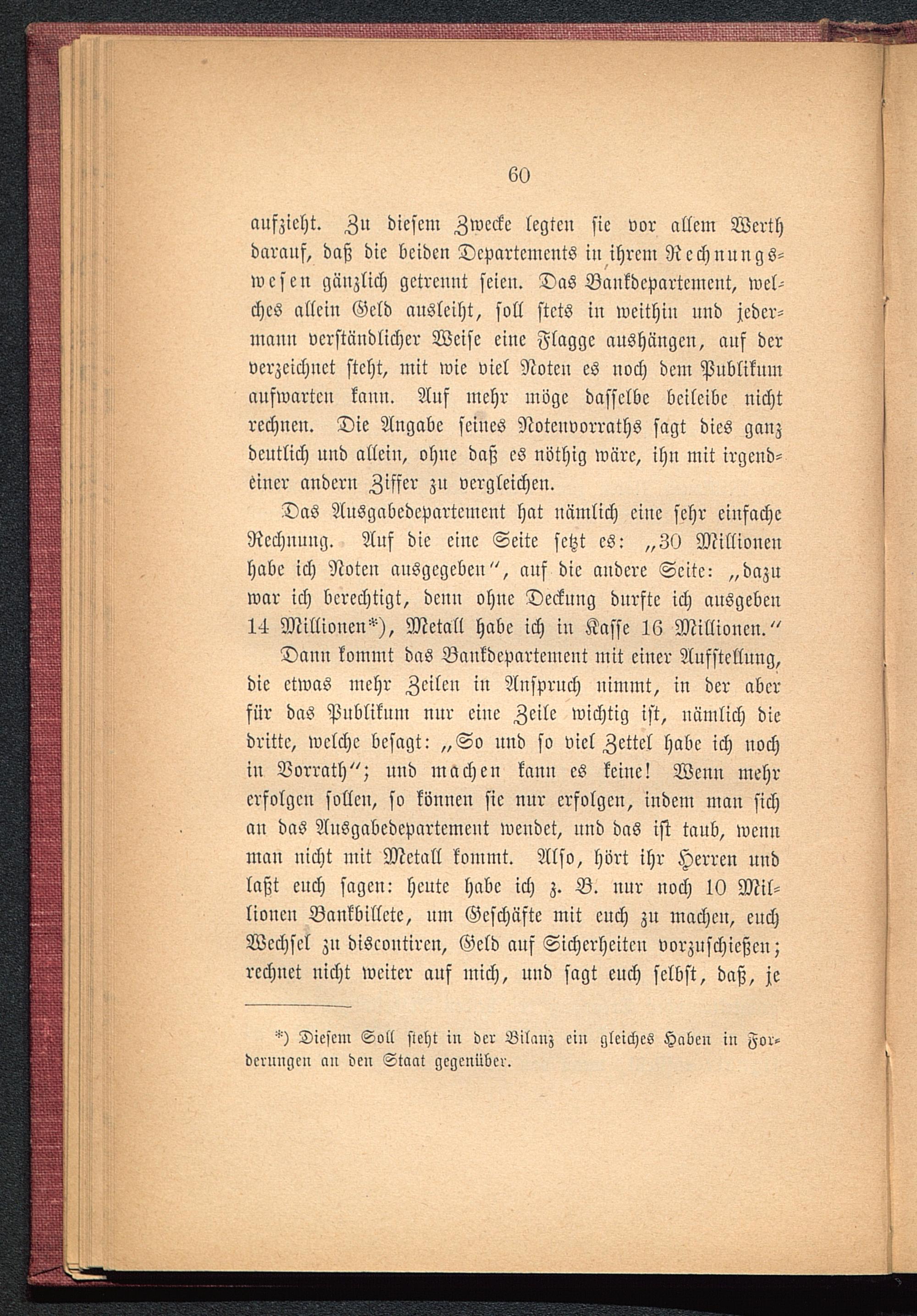 aufzieht. Zu diesem Zwecke legten sie vor allem Werthdarauf, daß die beiden Departements in ihrem Rechnungs-wesen gänzlich getrennt seien. Das Bankdcpartcment, wel-ches allein Geld ausleiht, soll stets in weithin und jeder-mann verständlicher Weise eine Flagge aushängen, auf derverzeichnet steht, mit wie viel Noten es noch dem Publikumaufwarten kann. Auf mehr möge dasselbe beileibe nichtrechnen. Die Angabe seines Notcnvorraths sagt dies ganzdeutlich und allein, ohne daß es nöthig wäre, ihn mit irgend-einer andern Ziffer zu vergleichen.