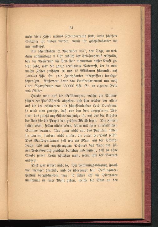 Horcht man auf die Erklärungen, welche die Stimm-führcr der Pcel-Thcorie abgeben, und hier wieder vor allemauf die des erfahrenen und scharfdenkenden Lord Ovcrstone,so wird man gewahr, daß von den drei angegebenen Mo-tiven das zuletzt angeführte dasjenige ist, auf das die Urheberder Acte für die Praxis den größten Werth legen. Die Ziffernsollen reden, sollen allein reden, sollen mit ihrer unerbittlichenStimme warnen. Und zwar nicht nur das Publikum sollensie warnen, sondern nicht minder die Leiter der Bank selbst.Das Bankdepartemcnt soll wie ein Mann auf der Schiffs-wacht stets mit angestrengtem Sehnerv das Auge auf sei-nen Notcnvorrath gerichtet dastehen und wissen, daß es ohneGnade seinen Kram schließen muß, wenn ihm der Vorrathausgeht.