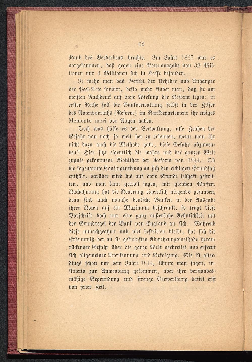 Doch was hälfe es der Verwaltung, alle Zeichen derGefahr von noch so weit her zu erkennen, wenn man ihrnicht dazu auch die Methode gäbe, diese Gefahr abzuwen-den? Hier sitzt eigentlich die wahre und der ganzen Weltzugute gekommene Wohlthat der Reform von 1844. Obdie sogenannte Contingentirung an sich den richtigen Grundsatzenthält, darüber wird bis auf diese Stunde lebhaft gestrit-ten, und man kann getrost sagen, mit gleichen Waffen.Nachahmung hat die Neuerung eigentlich nirgends gefunden,denn sind auch manche deutsche Banken in der Ausgabeihrer Noten auf ein Maximum beschränkt, so trägt dieseVorschrift doch nur eine ganz äußerliche Aehnlichkcit mitder Grundregel der Bank von England an sich. Währenddiese »«nachgeahmt und viel bestricken bleibt, hat sich dieErkenntniß der an sie geknüpften Abwehrungsmcthodc heran-rückender Gefahr über die ganze Welt verbreitet und erfreutsich allgemeiner Anerkennung und Befolgung. Sie ist aller-dings schon vor dem Jahre l844, könnte mag sagen, in-stinktiv zur Anwendung gekommen, aber ihre verstandes-mäßige Begründung und strenge Verwerthung datirt erstvon jener Zeit.