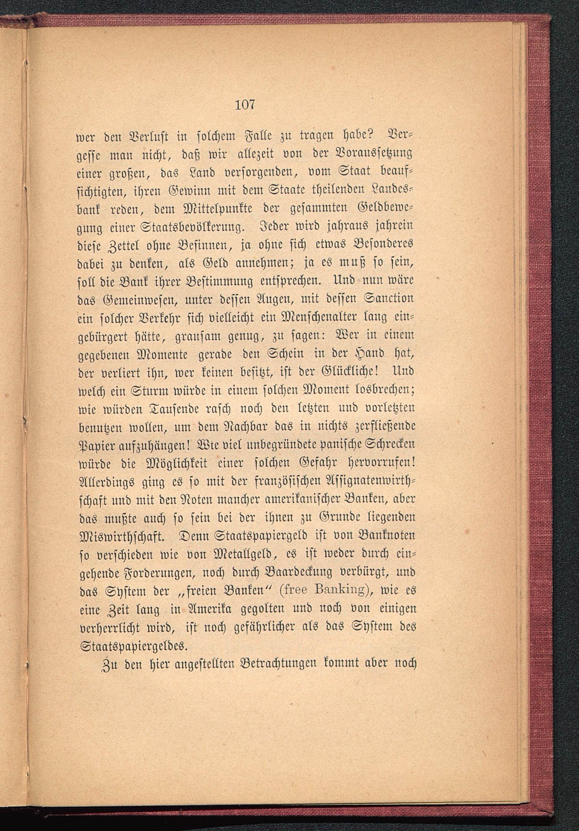 wer den Verlust in solchem Falle zu tragen habe? Ver-gesse man nicht, daß wir allezeit von der Voraussetzungeiner großen, das Land versorgenden, vom Staat beauf-sichtigten, ihren Gewinn mit dem Staate theilenden Landcs-bank reden, dem Mittelpunkte der gesummten Gcldbewc-gung einer Staatsbevölkcrung. Jeder wird jahraus jahreindiese Zettel ohne Besinnen, ja ohne sich etwas Besonderesdabei zu denken, als Geld annehmen; ja es muß so sein,soll die Bank ihrer Bestimmung entsprechen. Und nun wäredas Gemeinwesen, unter dessen Augen, mit dessen Sanctionein solcher Verkehr sich vielleicht ein Menschenaltcr lang ein-gebürgert hätte, grausam genug, zu sagen: Wer in einemgegebenen Momente gerade den Schein in der Hand hat,der verliert ihn, wer keinen besitzt, ist der Glückliche! Undwelch ein Sturm würde in einem solchen Moment losbrechen;wie würden Tausende rasch noch den letzten und vorletztenbenutzen wollen, um dem Nachbar das in nichts zerfließendePapier aufzuhängen! Wie viel unbegründete panische Schreckenwürde die Möglichkeit einer solchen Gefahr hervorrufen!Allerdings ging es so mit der französischen Assignatenwirth-schaft und mit den Noten mancher amerikanischer Banken, aberdas mußte auch so sein bei der ihnen zu Grunde liegendenMiswirthschast. Denn Staatspapicrgeld ist von Banknotenso verschieden wie von Metallgeld, es ist weder durch ein-gehende Forderungen, noch durch Baardecknng verbürgt, unddas System der „freien Banken" (trsv LnnllinZ), wie eseine Zeit lang in Amerika gegolten und noch von einigenverherrlicht wird, ist noch gefährlicher als das System desStaatspapicrgeldes.