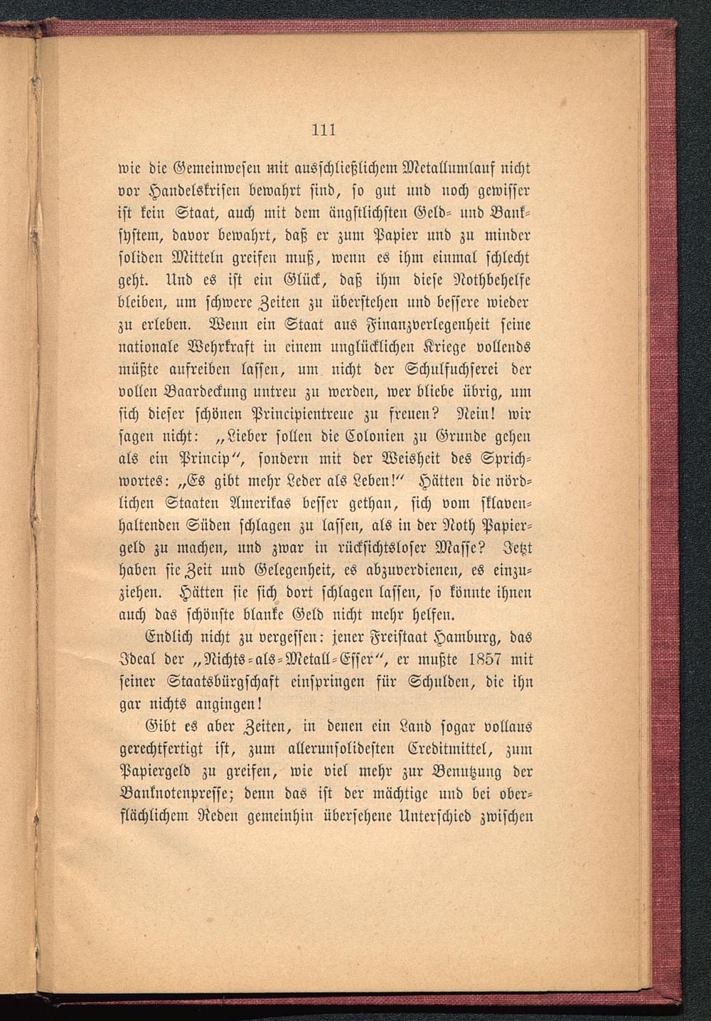 Endlich nicht zu vergessen: jener Freistaat Hamburg , dasIdeal der „Nichts-als-Metall-Esser", er mußte 1857 mitseiner Staatsbürgschaft einspringen für Schulden, die ihngar nichts angingen!