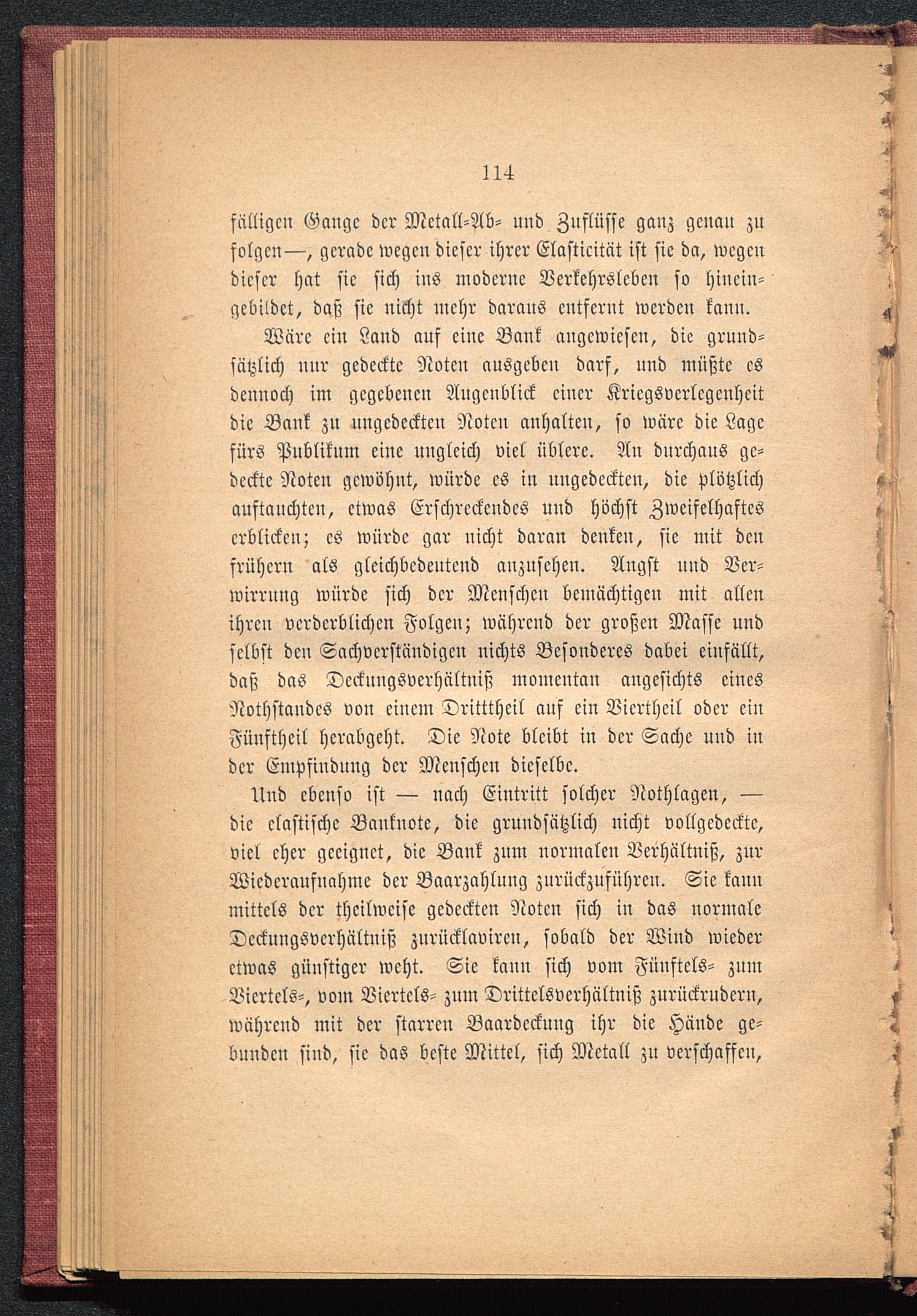 Und ebenso ist — nach Eintritt solcher Nothlagen, —die elastische Banknote, die grundsätzlich nicht vollgcdecktc,viel eher geeignet, die Bank zum normalen Verhältniß, zurWiederaufnahme der Baarzahlung zurückzuführen. Sie kannmittels der thcilwcise gedeckten Noten sich in das normaleDeckungsvcrhältuiß zurücklaviren, sobald der Wind wiederetwas günstiger weht. Sie kann sich vom Fünftels- znmViertels-, vom Viertels- zum Drittclsverhältniß zurückrudcru,während mit der starren Baardcckuug ihr die Hände ge-bunden sind, sie das beste Mittel, sich Metall zu verschaffen,