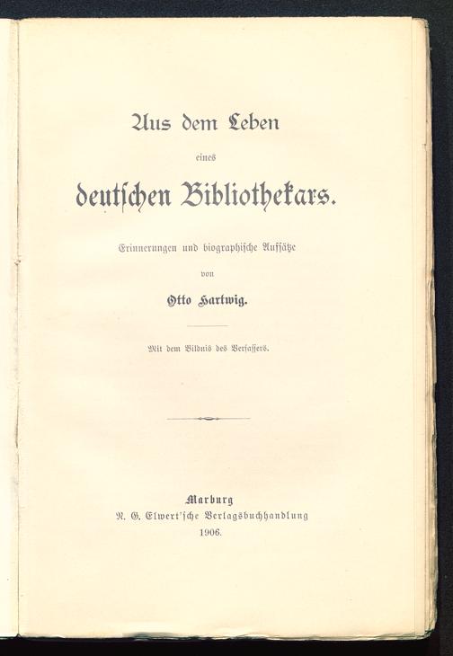 Aus dem Lebeneinesdeutschen Bibliothekars.Erinnerungen und biographische AufsätzewmHtto Kartwig.Ältit dem Bildnis des Verfassers.Marburg N. G. Elwert'sche Verlagsbuchhandlung1906 .
