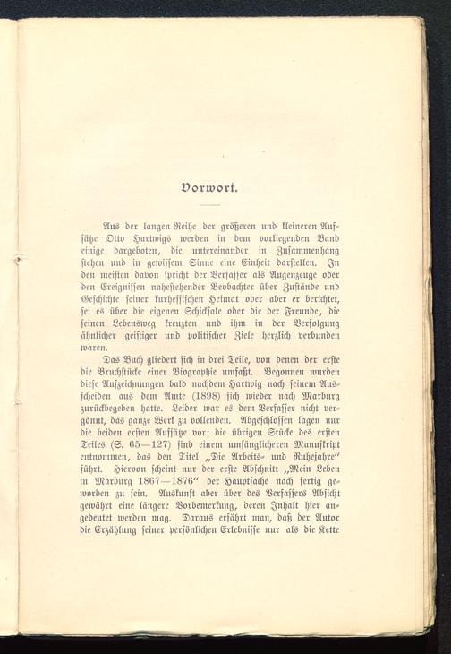 Aus der langen Reihe der größeren und kleineren Auf-sätze Otto Hartwigs werden in dem vorliegenden Bandeinige dargeboten, die untereinander in Zusammenhangstehen und in gewissem Sinne eine Einheit darstellen. Inden meisten davon spricht der Verfasser als Augenzeuge oderden Ereignissen nahestehender Beobachter über Zustände undGeschichte seiner knrhessischen Heimat oder aber er berichtet,sei es über die eigenen Schicksale oder die der Freunde, dieseinen Lebensweg kreuzten und ihm in der Verfolgungähnlicher geistiger und politischer Ziele herzlich verbundenwaren.