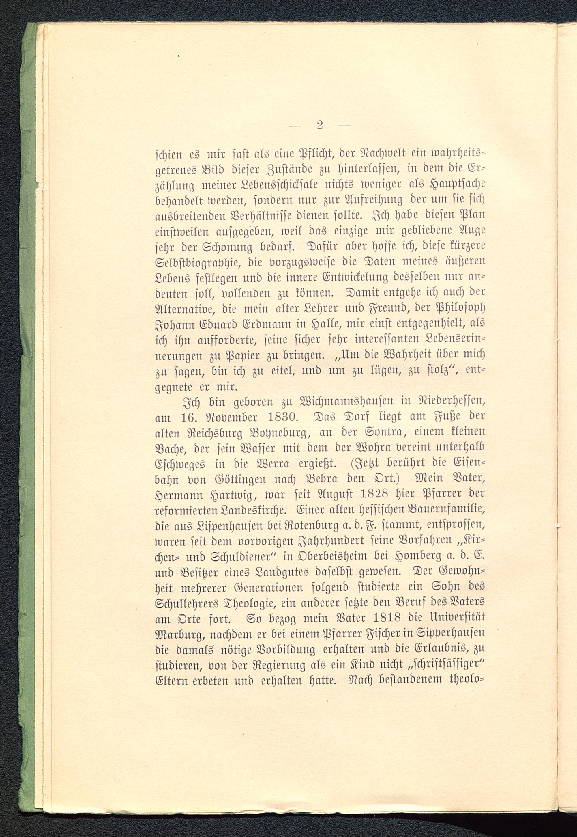 Ich bin geboren zu Wichmannshauscn in Niederhessen,am 16. November 1830. Das Dorf liegt am Fuße deralten Reichsburg Boyueburg, au der Sontra , einem kleinenBache, der sein Wasser mit dem der Wohra vereint unterhalbEschweges in die Wcrra ergießt. (Jetzt berührt die Eisen-bahn von Göttingen nach Bebra den Ort.) Mein Vater,Hermann Hartwig, war seit August 1828 hier Pfarrer derreformierten Landeskirche. Einer alten hessischen Bauernfamilie,die aus Lispenhauseu bei Rotcnburg a. d. F. stammt, entsprossen,waren seit dem vorvorigen Jahrhundert seine Vorfahren „Kir-chen- und Schuldiener" in Oberbeisheim bei Homberg a. d. E.und Besitzer eines Landgutes daselbst gewesen. Der Gewohn-heit mehrerer Generationen folgend studierte ein Sohn desSchullehrers Theologie, ein anderer setzte den Beruf des Vatersam Orte fort. So bezog mein Vater 1818 die UniversitätMarburg , nachdem er bei einem Pfarrer Fischer in Sipperhausendie damals nötige Vorbildung erhalten und die Erlaubnis, zustudieren, von der Regierung als ein Kind nicht „schriftsässigcr"Eltern erbeten und erhalten hatte. Nach bestandenem theolo-