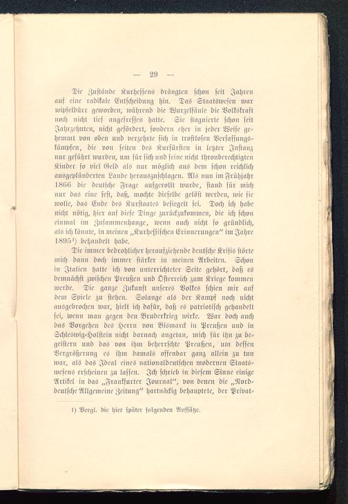 Die immer bedrohlicher heraufziehende deutsche Krisis störtemich dann doch immer stärker in meinen Arbeiten. Schonin Italien hatte ich von unterrichteter Seite gehört, daß esdemnächst zwischen Preußen und Österreich znm Kriege kommenwerde. Die ganze Zukunft unseres Volkes schien mir aufdem Spiele zu stehen. Solange als der Kampf noch nichtansgebrvchen war, hielt ich dafür, daß es patriotisch gehandeltsei, wenn man gegen den Bruderkrieg wirke. War doch auchdas Vorgehen des Herrn von Bismarck in Preußen und inSchleswig-Holstein nicht darnach angetan, mich für ihn zu be-geistern und das von ihm beherrschte Preußen, um dessenVergrößerung es ihm damals offenbar ganz allein zu tunwar, als das Ideal eines nationaldeutschen modernen Staats-wesens erscheinen zu lassen. Ich schrieb in diesem Sinne einigeArtikel in das „Frankfurter Journal", von denen die „Nord-deutsche Allgemeine Zeitung" hartnäckig behauptete, der Privat-