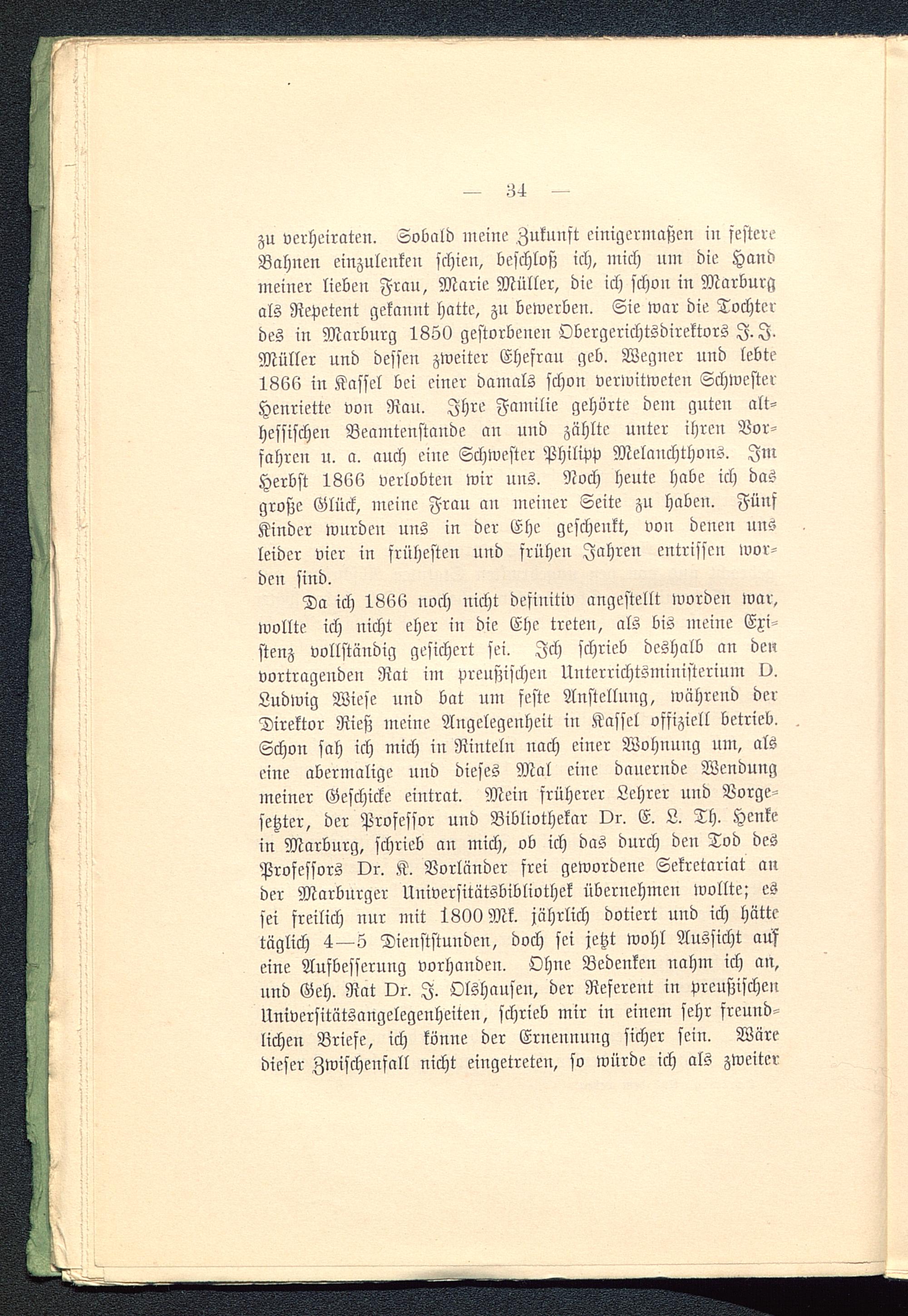 Da ich 1866 noch nicht definitiv angestellt worden war,wollte ich nicht eher in die Ehe treten, als bis meine Exi-stenz vollständig gesichert sei. Ich schrieb deshalb an denvortragenden Rat im preußischen Unterrichtsministerium 1).Ludwig Wiese und bat um feste Anstellung, während derDirektor Rieß meine Angelegenheit in Kassel offiziell betrieb.Schon sah ich mich in Rinteln nach einer Wohnung um, alseine abermalige und dieses Mal eine dauernde Wendungmeiner Geschicke eintrat. Mein früherer Lehrer und Vorge-setzter, der Professor und Bibliothekar Dr. E. L. Th. Henkein Marburg , schrieb an mich, ob ich das durch den Tod desProfessors Dr. K. Vorländer frei gewordene Sekretariat ander Marburger Universitätsbibliothek übernehmen wollte; essei freilich nur mit 1800 Mk. jährlich dotiert und ich hättetäglich 4—5 Dienststunden, doch sei jetzt wohl Aussicht aufeine Aufbesserung vorhanden. Ohne Bedenken nahm ich an,nnd Geh. Rat Dr. I. Olshausen, der Referent in preußischenUniversitätsangelegenheiten, schrieb mir in einem sehr freund-lichen Briefe, ich könne der Ernennung sicher sein. Wäredieser Zwischenfall nicht eingetreten, so würde ich als zweiter