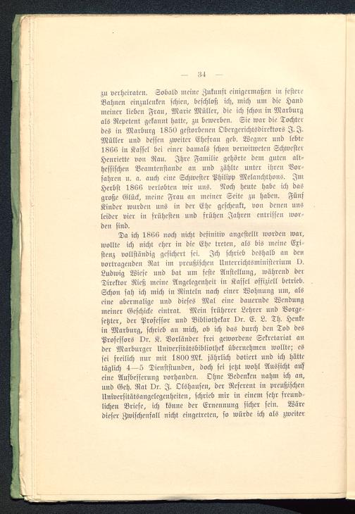 zu verheiraten. Sobald meine Zukunft einigermaßen in festereBahnen einzulenken schien, beschloß ich, mich um die Handmeiner lieben Frau, Marie Müller, die ich schon in Marburg als Repetent gekannt hatte, zu bewerben. Sie war die Tochterdes in Marburg 1850 gestorbenen Obergerichtsdirektors I. I.Müller und dessen zweiter Ehefrau geb. Wegner und lebte1866 in Kassel bei einer damals schon verwitweten SchwesterHenriette von Ran. Ihre Familie gehörte dem guten alt-hessischen Beamtenstande an und zählte unter ihren Vor-fahren u. a. auch eine Schwester Philipp Melanchthons . ImHerbst 1866 verlobten wir uns. Noch heute habe ich dasgroße Glück, meine Frau an meiner Seite zu haben. FünfKinder wurden uns in der Ehe geschenkt, von denen unsleider vier in frühesten und frühen Jahren entrissen wor-den sind.