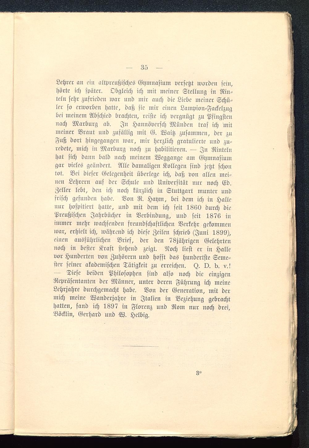 Lehrer an ein altprenßisches Gymnasium versetzt worden sein,hörte ich später. Obgleich ich mit meiner Stellung in Rin-teln sehr zufrieden war und mir auch die Liebe meiner Schü-ler so erworben hatte, daß sie mir einen Lampion-Fackelzugbei meinem Abschied brachten, reiste ich vergnügt zu Pfingstennach Marburg ab. In Hannöversch Münden traf ich mitmeiner Braut und zufällig mit G. Waitz zusammen, der zuFuß dort hingegangen war, mir herzlich gratulierte und zu-redete, mich in Marburg noch zu habilitieren. — In Rinteln hat sich dann bald nach meinem Weggange am Gymnasiumgar vieles geändert. Alle damaligen Kollegen sind jetzt schontot. Bei dieser Gelegenheit überlege ich, daß von allen mei-nen Lehrern auf der Schule und Universität nur noch Ed.Heller lebt, den ich noch kürzlich in Stuttgart munter undfrisch gefunden habe. Von R. Haym , bei dem ich in Hallenur hospitiert hatte, und mit dem ich seit 1860 durch diePreußischen Jahrbücher in Verbindung, und seit 1876 inimmer mehr wachsenden freundschaftlichen Verkehr gekommenwar, erhielt ich, während ich diese Zeilen schrieb (Juni 1899),einen ausführlichen Brief, der den 78jährigen Gelehrtennoch in bester Kraft stehend zeigt. Noch liest er in Hallevor Hunderten von Zuhörern und hofft das hundertste Seme-ster seiner akademischen Tätigkeit zu erreichen. (I O. b. v.!— Diese beiden Philosophen sind also noch die einzigenRepräsentanten der Männer, unter deren Führung ich meineLehrjahre durchgemacht habe. Von der Generation, mit dermich meine Wanderjahre in Italien in Beziehung gebrachthatten, fand ich 1897 in Florenz und Rom nur noch drei,Böcklin, Gerhard und W. Helbig.