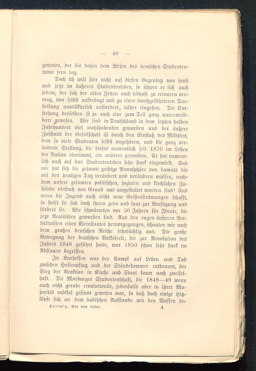 Doch ich will hier nicht anf diesen Gegensatz von sonstund jetzt im äußeren Stndentenleben, so schwer er sich auchjedem, der sich der alten Zeiten noch lebhaft zu erinnern ver-mag, von selbst aufdrängt und zu einer dnrchgeftthrtcren Dar-stellung unwillkürlich auffordert, näher eingehen. Die Ent-stehung desselben ist ja auch eine zum Teil ganz unvermeid-bare gewesen. Wir sind in Deutschland in dem letzten halbenJahrhundert viel wohlhabender geworden und der äußereZuschnitt der Gesellschaft ist durch den Einfluß des Militärs,dem so viele Studenten selbst angehören, und die ganz ver-änderte Stellung, die dieses namentlich seit 1870 im Lebender Nation einnimmt, ein anderer geworden. Er hat nament-lich auch aus das Stndentenleben sehr stark eingewirkt. Undwie hat sich die gesamte geistige Atmosphäre von damals bisanf den heutigen Tag verändert und verändern müssen, nach-dem unsere gesamten politischen, sozialen und kirchlichen Zu-stände vielfach von Grund aus umgestaltet worden sind! Undwenn die Jugend auch nicht neue Geistesströmnngcn schafft,so stellt sie sich doch ihnen gern und laut zur Verfügung undfördert sie. Wir schwärmten vor 50 Jahren für Ideale, diejetzt Realitäten geworden sind. Aus den engen äußeren Ver-hältnissen eines Kleinstaates hervorgegangen, schauten wir nachdem großen deutschen Reiche sehnsüchtig aus. Die großeBewegung der deutschen Volksseele, die zur Revolution desJahres 1848 geführt hatte, war 1850 schon sehr stark imAbflauen begriffen.