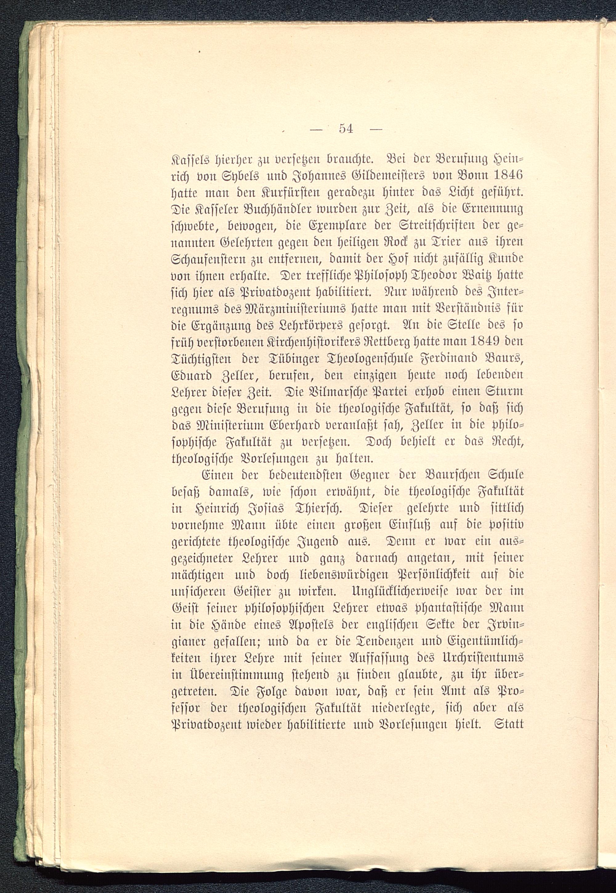 Einen der bedeutendsten Gegner der Banrschen Schulebesaß damals, wie schon erwähnt, die theologische Fakultätin Heinrich Josias Thiersch . Dieser gelehrte und sittlichvornehme Mann übte einen großen Einfluß auf die Positivgerichtete theologische Jugend aus. Denn er war ein aus-gezeichneter Lehrer und ganz darnach angetan, mit seinermächtigen und doch liebenswürdigen Persönlichkeit auf dieunsicheren Geister zu wirken. Unglücklicherweise war der imGeist seiner philosophischen Lehrer etwas phantastische Mannin die Hände eines Apostels der englischen Sekte der Jrvin-giancr gefallen; und da er die Tendenzen und Eigentümlich-keiten ihrer Lehre mit seiner Auffassung des Urchristentumsin Übereinstimmung stehend zu finden glaubte, zu ihr über-getreten. Die Folge davon war, daß er sein Amt als Pro-fessor der theologischen Fakultät niederlegte, sich aber alsPrivatdozent wieder habilitierte und Vorlesungen hielt. Statt
