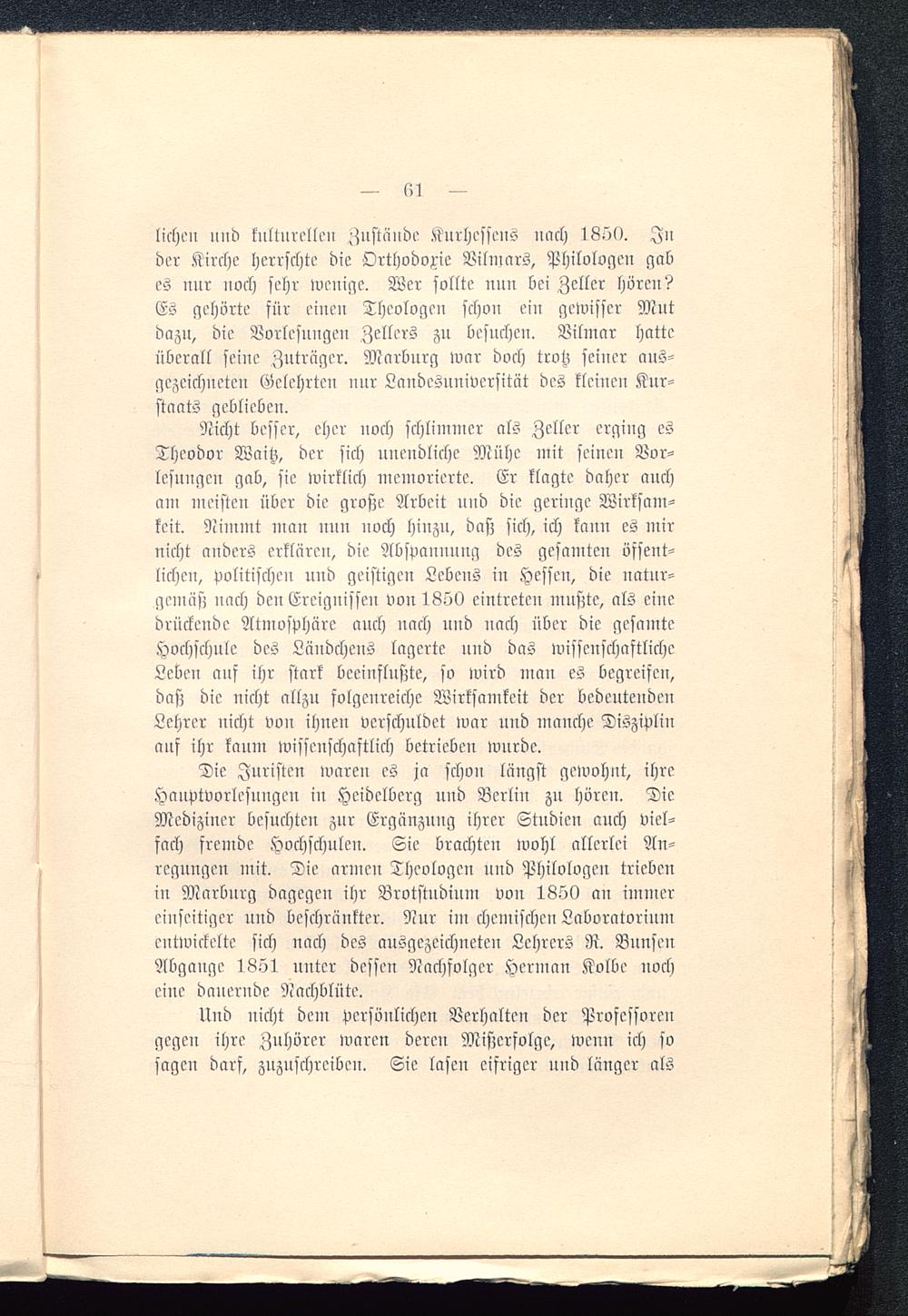 Nicht besser, eher noch schlimmer als Zelter erging esTheodor Waitz , der sich unendliche Mühe mit seinen Vor-lesungen gab, sie wirklich memorierte. Er klagte daher aucham meisten über die große Arbeit und die geringe Wirksam-keit. Nimmt man nun noch hinzu, daß sich, ich kann es mirnicht anders erklären, die Abspannung des gesamten öffent-lichen, politischen und geistigen Lebens in Hessen , die natur-gemäß nach den Ereignissen Pon 1850 eintreten mußte, als einedrückende Atmosphäre auch nach und nach über die gesamteHochschule des Ländchens lagerte und das wissenschaftlicheLeben auf ihr stark beeinflußte, so wird man es begreifen,daß die nicht allzu folgenreiche Wirksamkeit der bedeutendenLehrer nicht twn ihnen verschuldet war und manche Disziplinauf ihr kaum wissenschaftlich betrieben wurde.